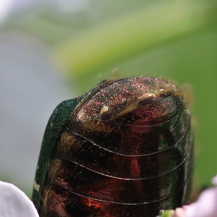 Inte ofta jag avbildar djurens bakdel, men denna är speciell och typisk för den gräsgröna guldbaggen (till skillnad från den olivgröna). Vackert kopparglänsande fångar den upp solljuset.