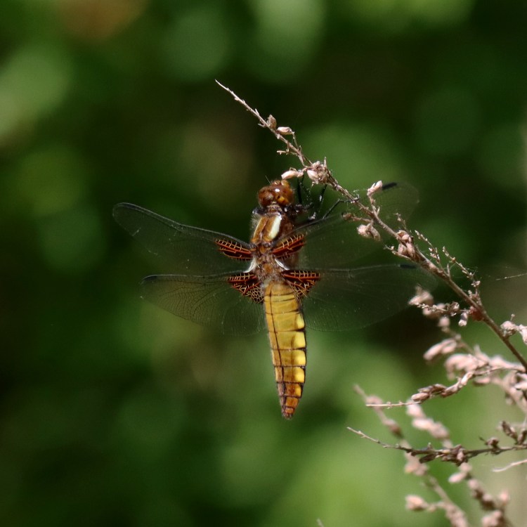 Började försiktigt att fotografera trollsländor förra året. En inte helt lätt uppgift skulle det visa sig. I första hand var det viktigt för att kunna identifiera några av de 64 svenska arterna. De större sländorna är ibland samarbetsvilliga för posering medan mosaiksländor ständigt drar omkring och de mindre flicksländorna visar på en uppsjö av variationer. Idag fann jag ett par hanar enligt ovan som skulle visa sig vara en av de få observerade Spetsfläckade trollsländorna (Libellula fulva) som setts i Bohuslän. Rekommenderar varmt fälthandboken ”Trollsländor i Sverige” för den vetgirige.