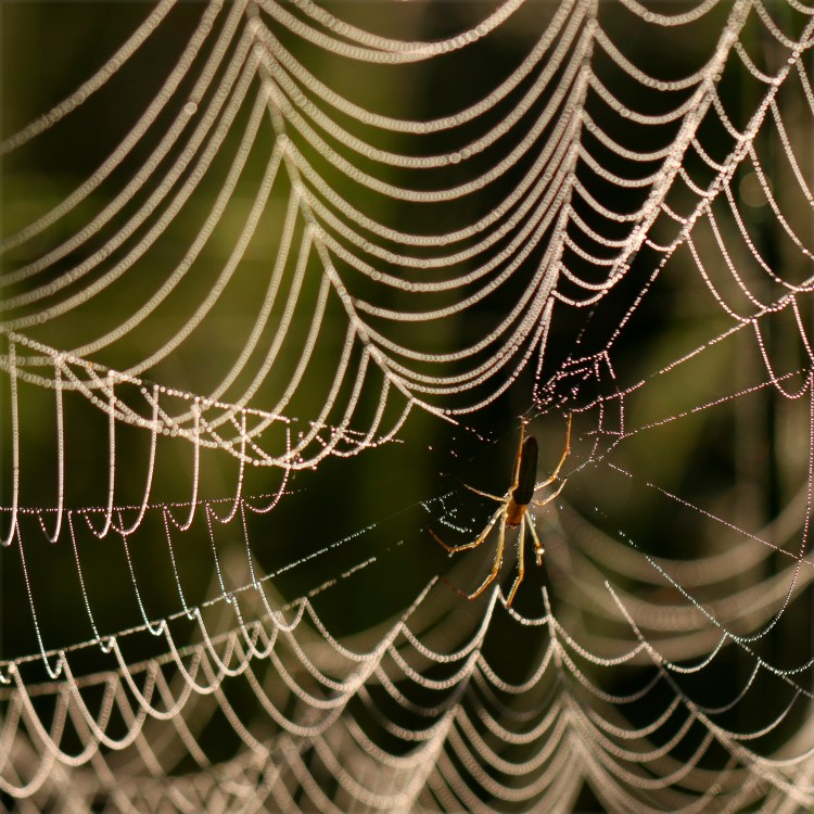 Försöker istället fånga in det bländande morgonljuset. Blicken dras till alla spindelnät, som likt sköra fallskärmar vilar på grässtråna. I centrum på de flesta näten sitter en Sträckkäkspindel av något slag och inväntar de första flygburna bytena. Men de sitter fortfarande dolda i gräset i väntan på den värme som skall torka dem. En Rödfransad björnspinnare (Diacrisia sannio) försöker dölja sig men den gulröda pälskragen lyser avslöjande kontrastrikt.