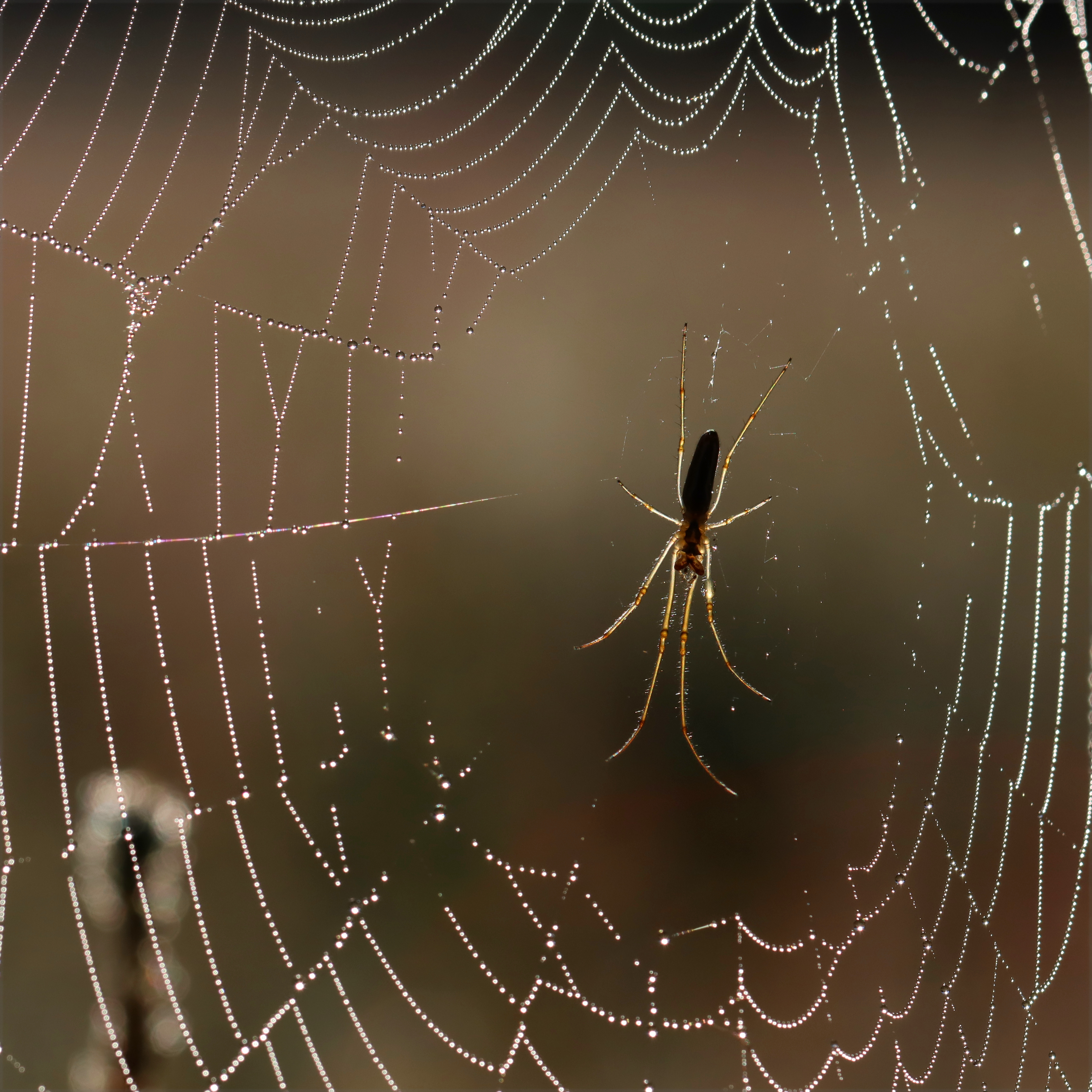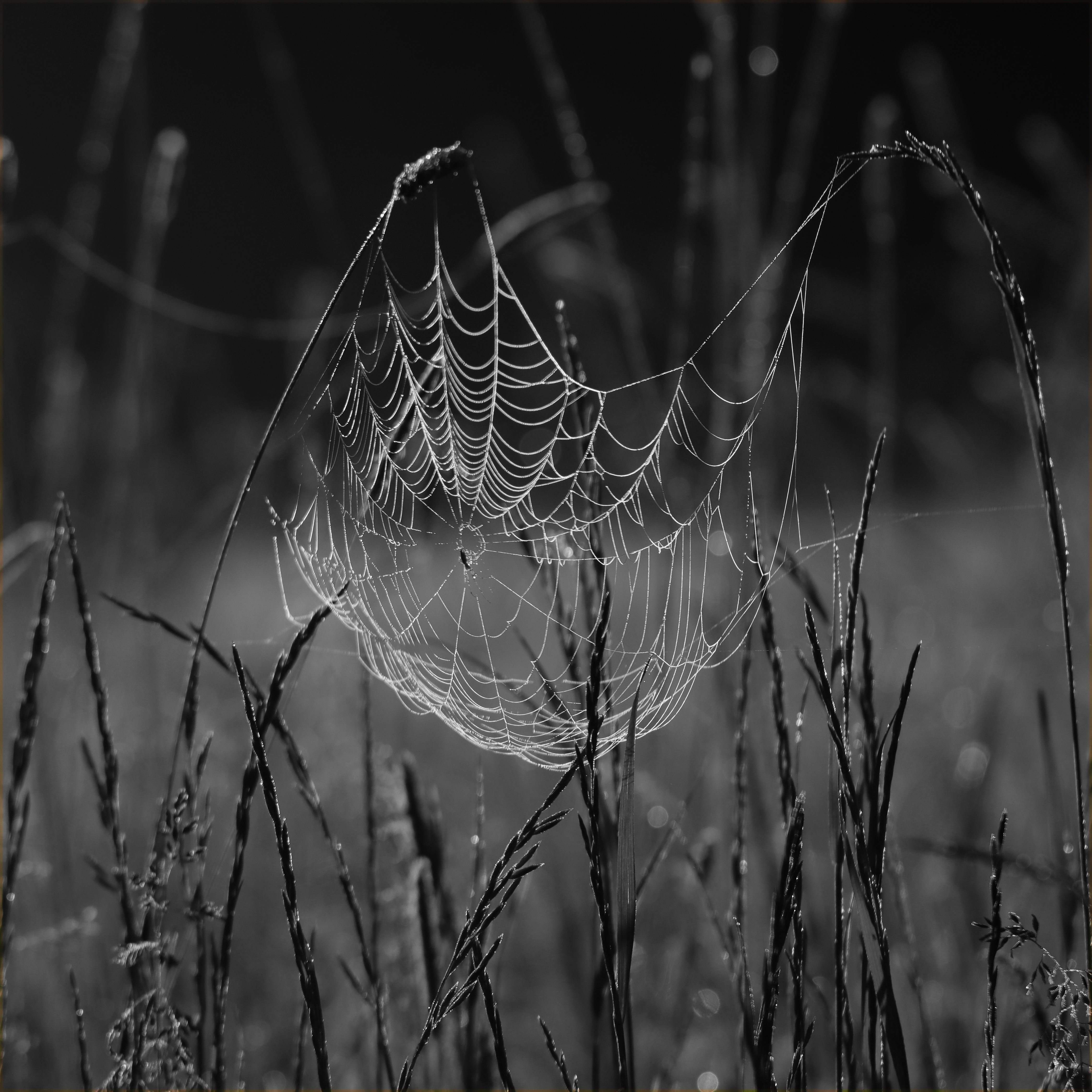 Försöker istället fånga in det bländande morgonljuset. Blicken dras till alla spindelnät, som likt sköra fallskärmar vilar på grässtråna. I centrum på de flesta näten sitter en Sträckkäkspindel av något slag och inväntar de första flygburna bytena. Men de sitter fortfarande dolda i gräset i väntan på den värme som skall torka dem. En Rödfransad björnspinnare (Diacrisia sannio) försöker dölja sig men den gulröda pälskragen lyser avslöjande kontrastrikt.