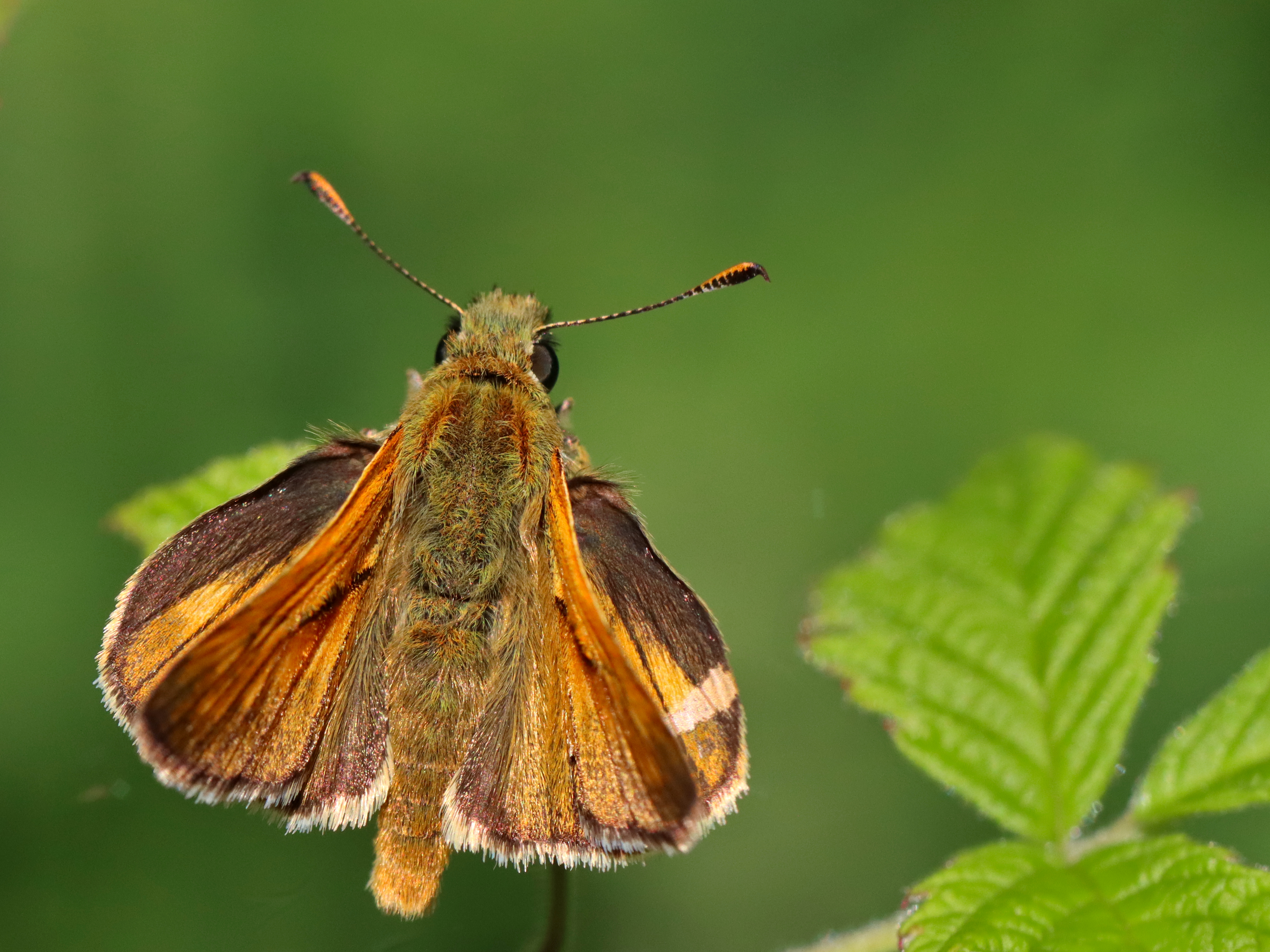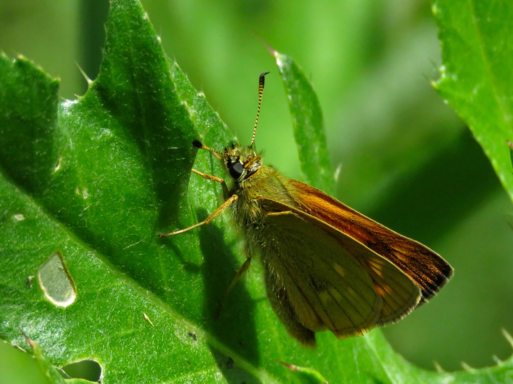 I often meet the Large skipper (Ochlodes sylvanus) on the edge of drier fields with abundant and tall grass. It seems to be favored by climate change and it likes to take over where more rare butterflies disappear. However, the population density is rarely high, which may be due to strong male instincts. These tend to be located in places where open corridors in a forest landscape coalesce, e.g. glades at crossroads or where a power line street or a creek over a hut meets a road. The males alternate between patrolling and waiting for passing females from any solar heated place, preferably a leaf or directly on the ground surface. If invading males enter the area, regular flight battalions occur, at a furious pace for the butterflies high above the tree tops.