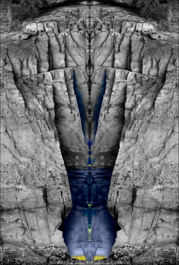 The original is a steep rock that is reflected in a small lake outside Strömstad. I just rotated the image 90 degrees and did an exact reflection with a little paint to try to find what I was looking for. Maybe the original will come up in a later post …….