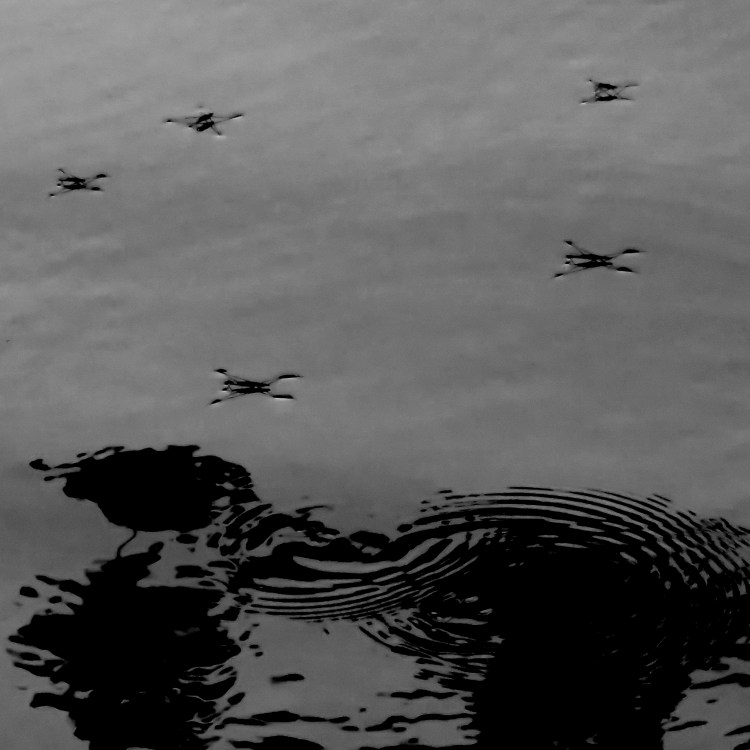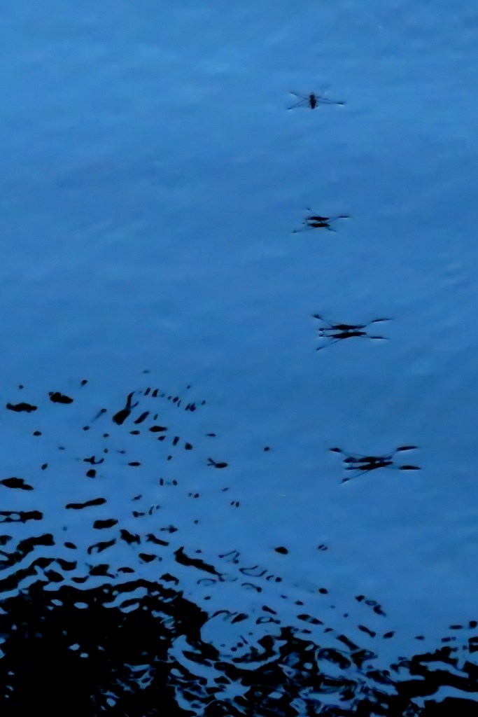 Vattnets ytspänning är ett otroligt fascinerande fenomen. Mycket skulle inte fungera om det inte fanns. Lyckligtvis är isen lättare än vatten. Ytspänningen skulle inte hjälpt nyisen som sjunkit till botten. Skräddaren och många andra vattenlevande insekter lever ut sin dans på lätta fötter, virvlar runt, paddlar och skjuter fart med svall runt. Deras dans skapar märkliga makrovågor som syns bäst i motljus en sen kväll, eller som på dessa bilder i halvskugga under träd vid sjökanten.