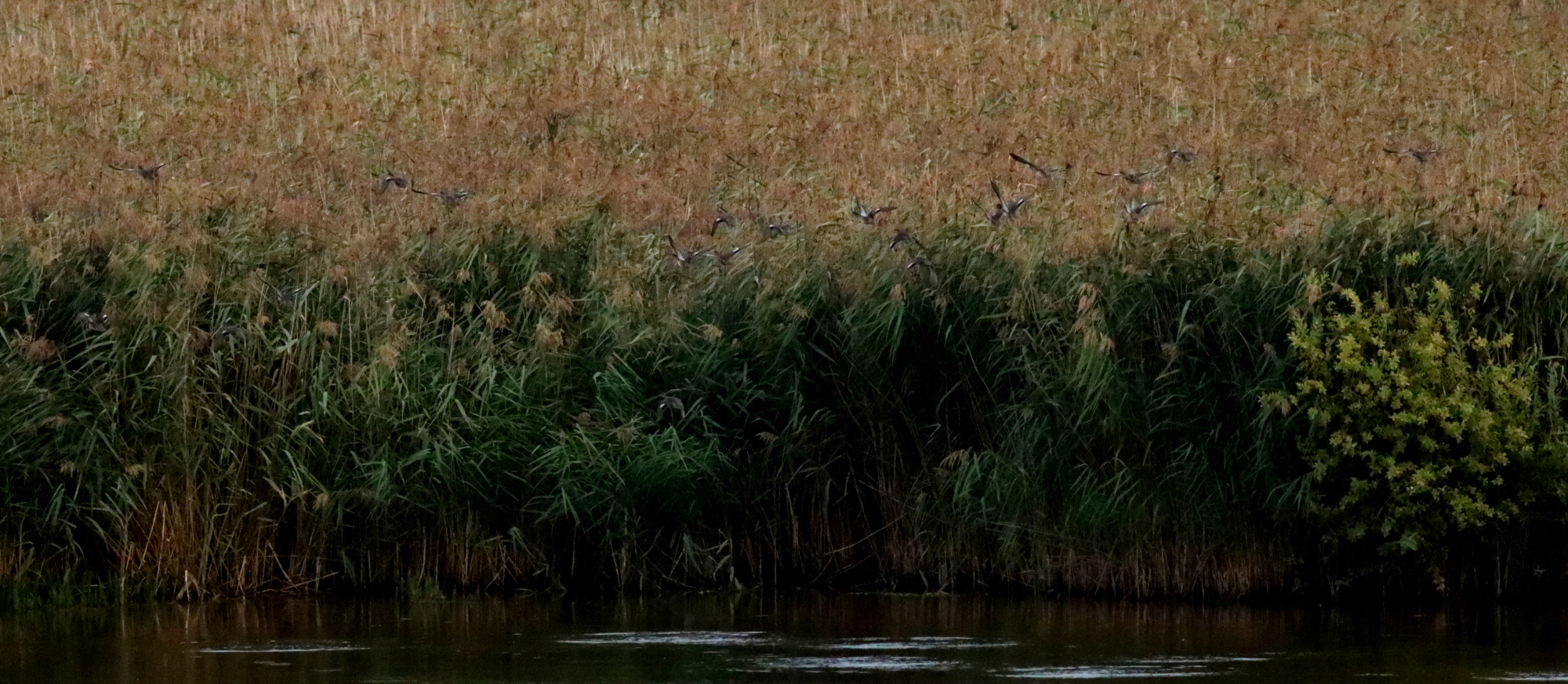 Vår minsta and, Krickan (Anas crecca) var en av de mer lättskrämda, ständigt vaksamma där de höll till i de grundare partierna av vassvikarna. Oftast lyfte alla samtidigt rakt upp och slukades upp av omgivningen tack vare deras kamouflagedräkt. Ibland är det bara den lilla svarta och vita vingspegeln som avslöjar dem i flykten. Här lyfter 21 krickor, ser ni dom alla?