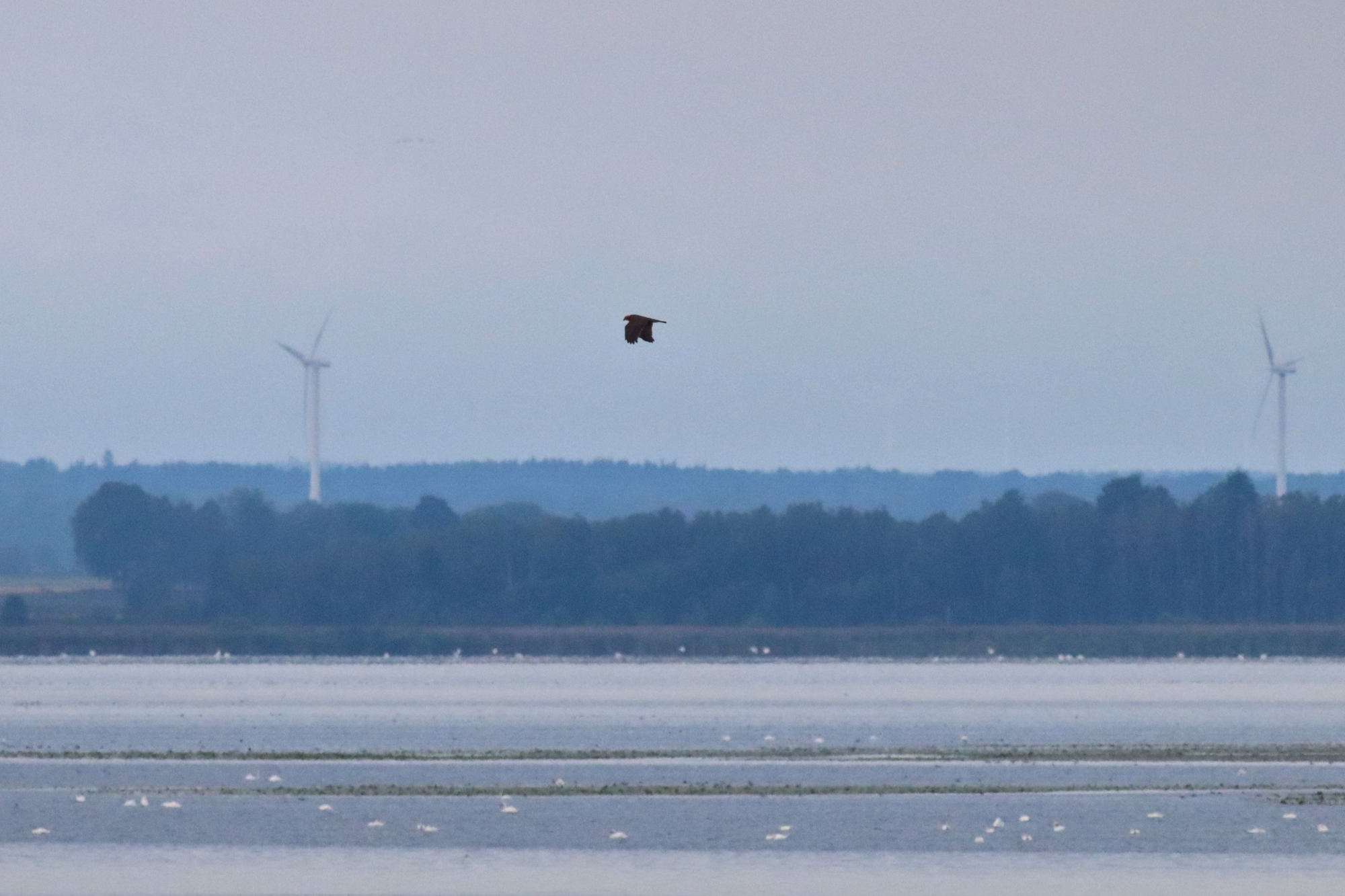 En ung Brun kärrhök (Circus aeruginosus) störde inte lugnet när den passerade på höjd över sjön, på tryggt avstånd från vindkraftverkens ibland farliga vingar. Annars höll de flesta kärrhökarna till på ängarna runt sjön. När pilgrimsfalken snabbt svepte förbi lågt över vassen lyfte dock i stort sett alla sjöfåglar, ja det skedde ibland även när ……