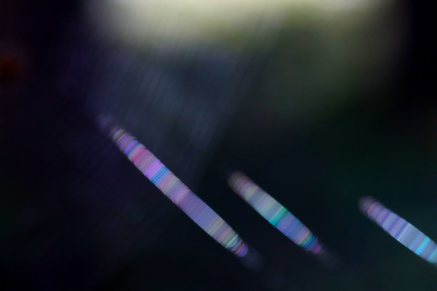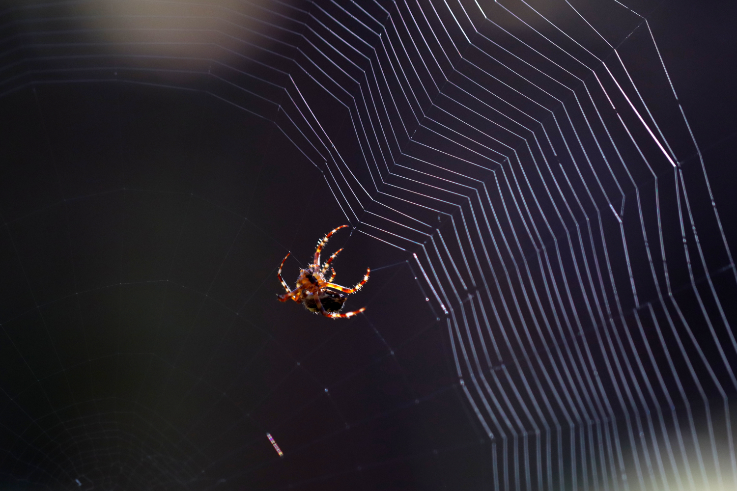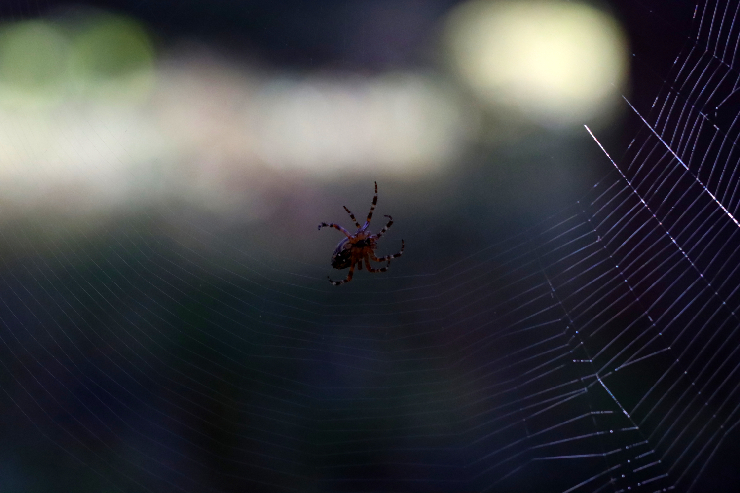 De tunna trådarna i nätet fångar upp ljuset som bryts i regnbågens färger och bildar mönster som på gamla vävda trasmattor. Ett ljus som antagligen inte spindelns byten ser, eller så kanske de bländas av skönheten. Lite fantasi får väl en superamatör ändå ha ……