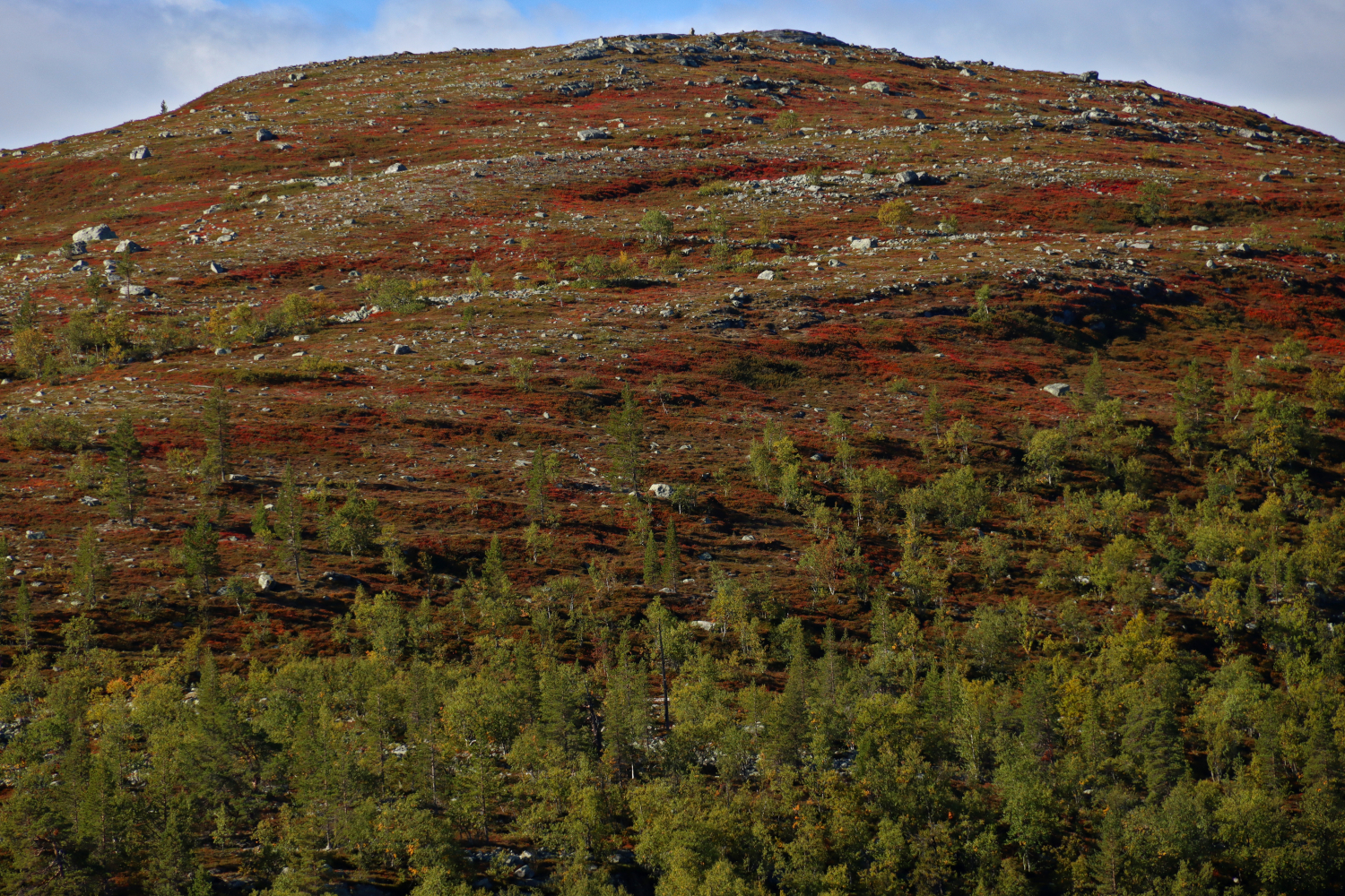 Inte bara skogen färgas röd av de höstliga blåbären, långt upp på kalfjället rodnar marken. Än så länge breder de svarta kråkbären ut sig på fjällheden, till nytta för hösttrötta brunbjörnar som behöver fylla på inför en vinter i ide. De matt blå odonen håller sig fortfarande längre ner, såpass fuktberoende som de är, men i skuggan av nya träd söker de sig också till nya marker. Bilder idag blir därför också en viktig dokumentation inför framtiden.