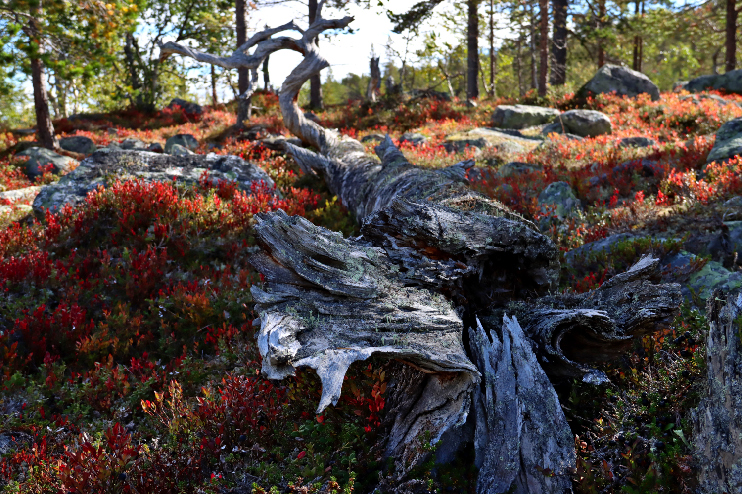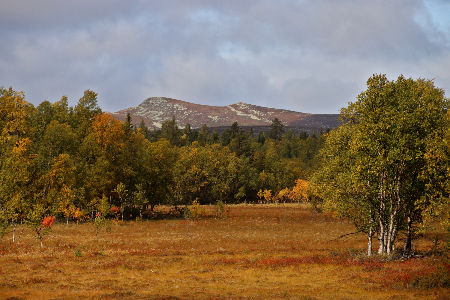 På avstånd kan man skymta Rogens låga fjäll genom skogen, kallas också faktiskt för lågfjäll. De når oftast bara upp till 1200-1300 meter över havet. Mjukt slipade av inlandsisen, och årtusenden av nederbörd. Redan tidigt på höstkanten ändrar de färgton, lite gråviolett som går över i rödbrunt allteftersom kylar kryper inpå. En färgskala skapad av öppna lavklädda stenfält och rishedar, med inslag av dvärgbjörk bland annat.