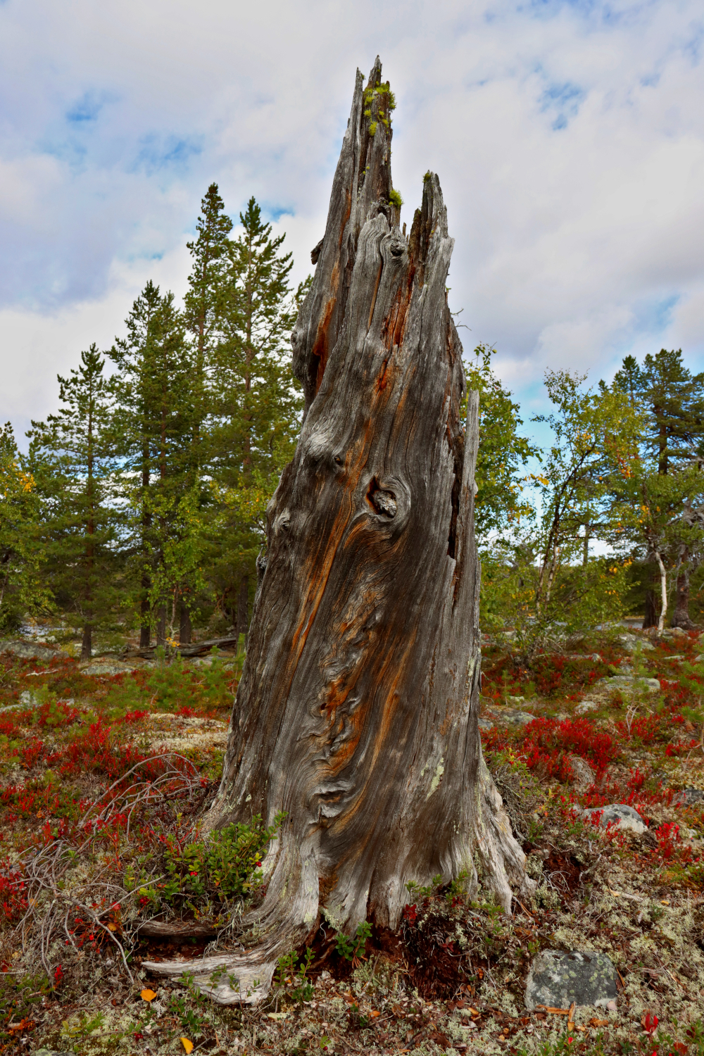 De torra och hårda relikerna av uråldriga tallar reser sig stolt över sina betydligt yngre släktingar. En bild som speglar de villkor som gäller på gränsen till kalfjället. När de första nybyggarna kom till dessa trakter var dessa tallar bara ungdomar. Nu i mogen ålder på 800 år kan de med all rätt vara stolta över sin bedrift att försöka nå fjällets jungfruliga mark. Många har överlevt de stora bränder som härjade på 1700 och 1800-talet, men också den sista större avverkningen som skedde i Rogenområdet på 1950-talet, som tur var utan skogsmaskiner.