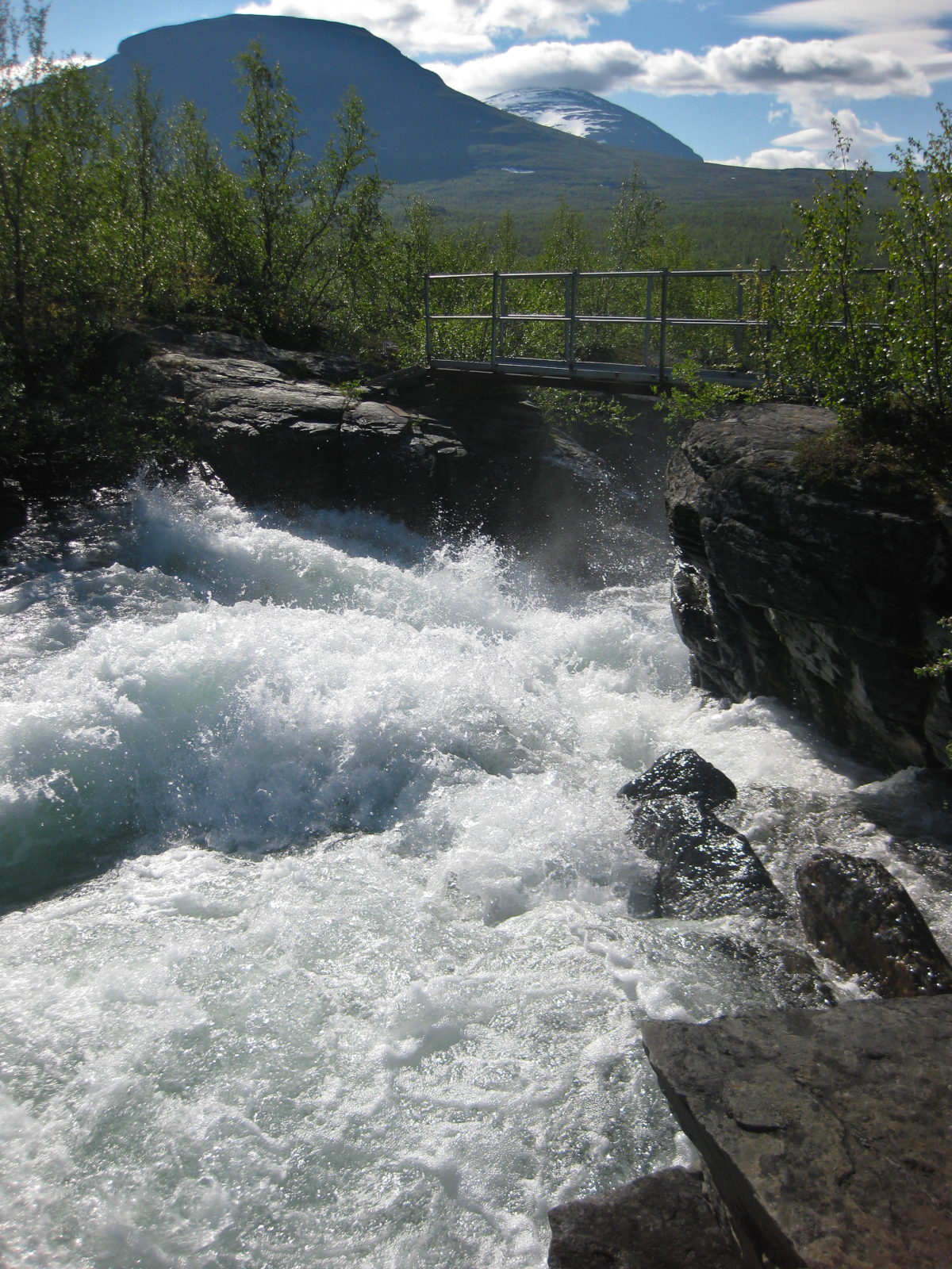 ”Problemet dök upp när jag skulle passera 3-metersbron över Skankaljokken. Bron var väck, bara fästet på ena sidan kvar. Någon hade lagt en planka över på smalaste stället. Men, djupet och forsen under samt plankans rörlighet, fick mig att vada till knäna med sandaler istället.”