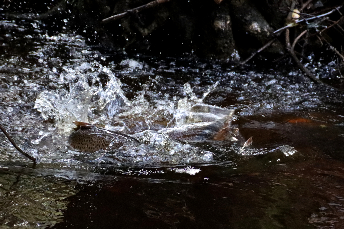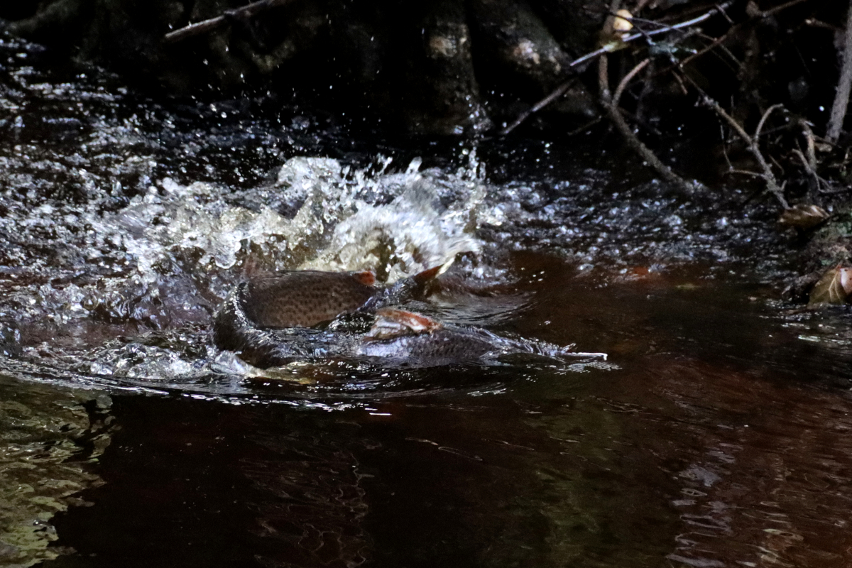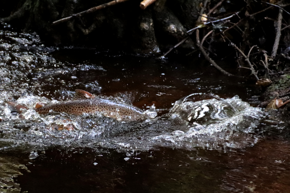 Under oktober månad har det kommit regn mer eller mindre varje dag. Inget för en lite bekvämare naturfilosof. Tog mig dock i kragen i fredags för att leta efter de som trivs i vatten, rikligt spetsat med syre. I skydd av en tät granskog meandrar sig en bäck lite yster efter regnandet på väg ut mot havet. Havsöringarna känner av detta i bäckmynningen och börjar vandra upp för årets kärleksäventyr, höstleken på grusiga bottnar.