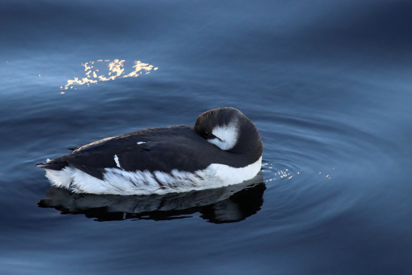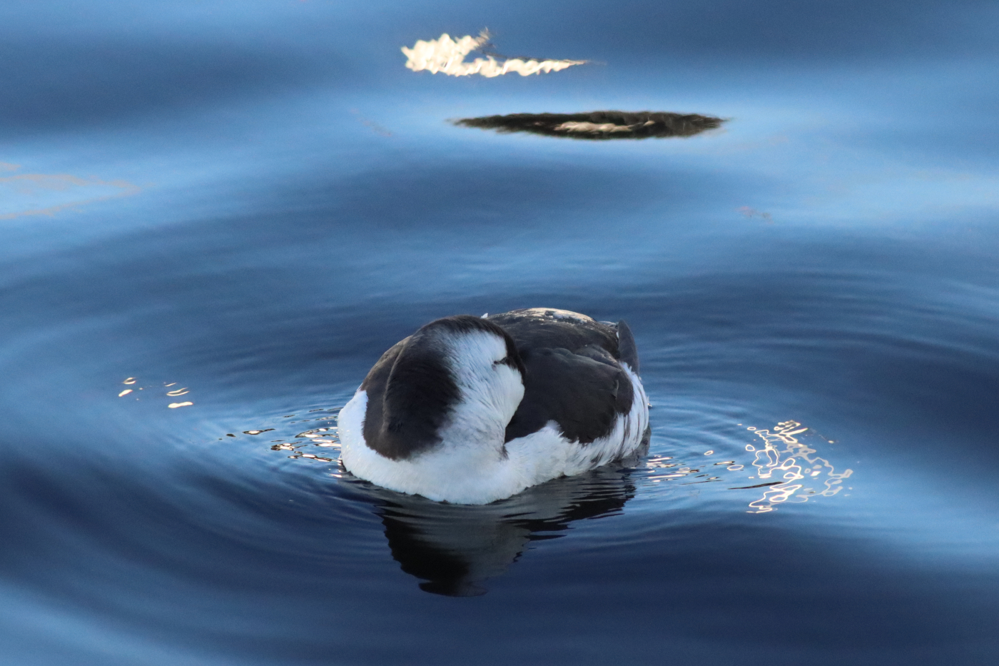 Ute på skäret härskade bara måsar och skarv i den kalla nordanvinden denna dag. Men inne i fiskhamnen, vid fiskebåtarna skymta jag något svart och vitt guppa i vattnet, Kontrasten blev skarp till den djupblå sjön och reflexerna från båtarna. En sillgrissla låg och sov med näbben under vingen, men kisade ibland på mig med ena ögat.