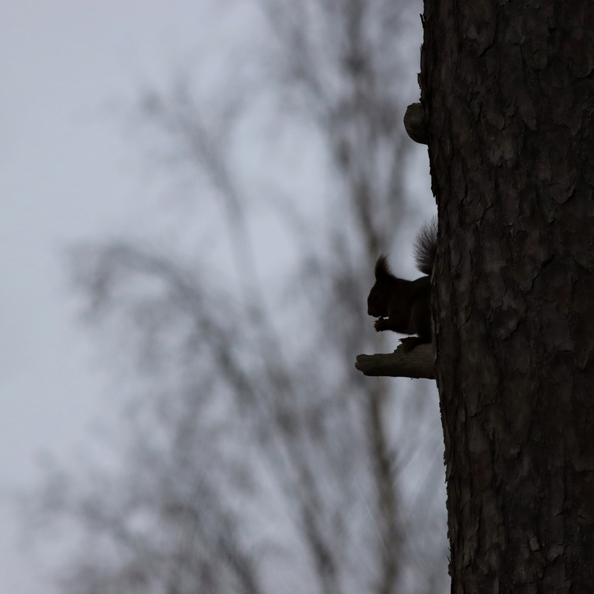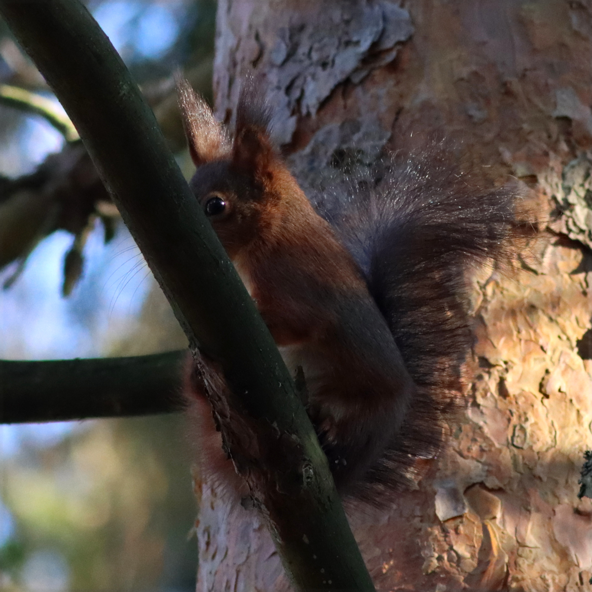 Det senaste året har jag känt mig iakttagen varhelst jag passerat ett träd, oavsett var jag har varit. Först ett prassel bakom en tall, likt en hackspett eller nötväcka på jakt efter insekter. Sedan ett lite irriterat smackande. Stannar man upp och smackar lågmält tillbaka tittar oftast ett par runda pliriga mörka ögon fram bakom stammen, undrande vem som inkräktar i skafferiet. Vår vanliga ekorre (Sciurus vulgaris) är relativt skygg på sin hemmaplan men mycket nyfiken. Vid fågelmatningen skyr den dock inga medel utan tar för sig av alla gratisprover.
