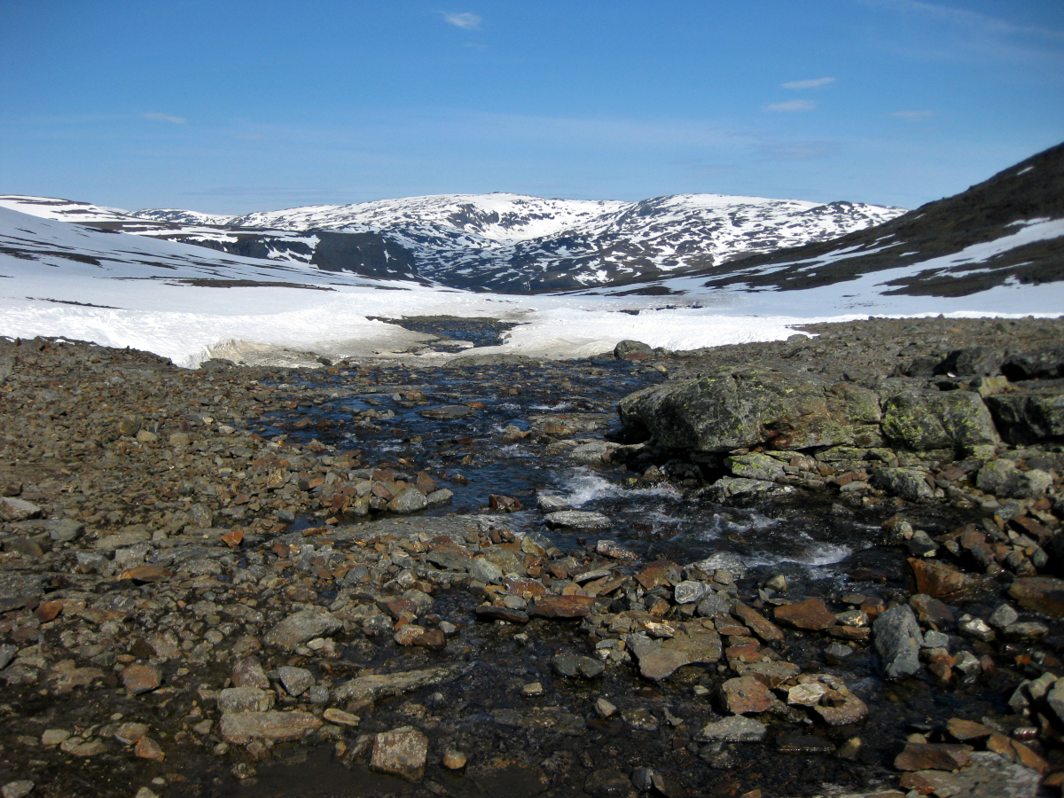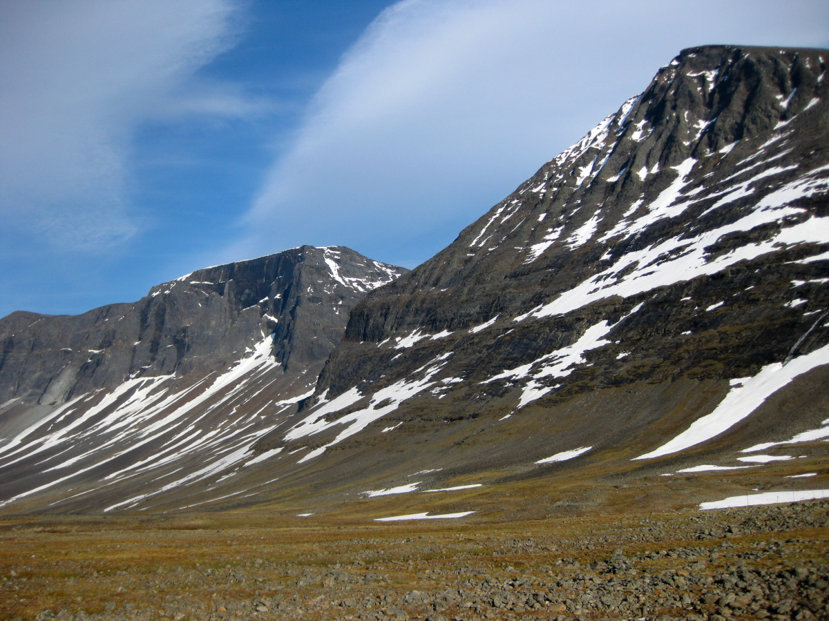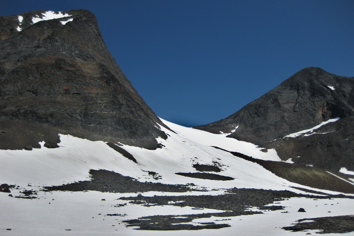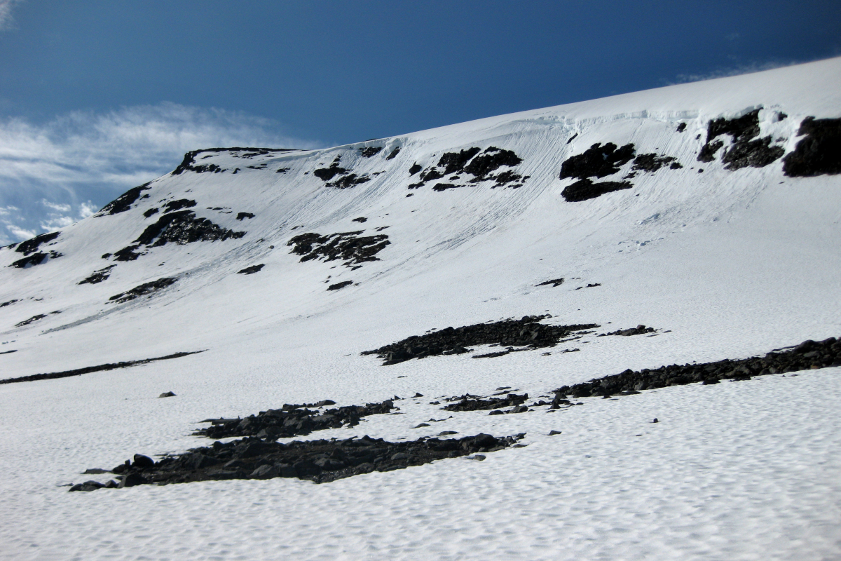 ”Kom iväg först av alla vid 8 och knata på rakt österut mot kammen för att kolla läget i den V-formade dalen upp mot passet. En hel del snöfält, ja rent av mest snö, men jag sick-sackade på barytorna där det gick. Snön var som väntat lös och vattensjuk, men bar för det mesta, speciellt de större fälten. I kanterna sjönk man dock till knäna titt som tätt.”