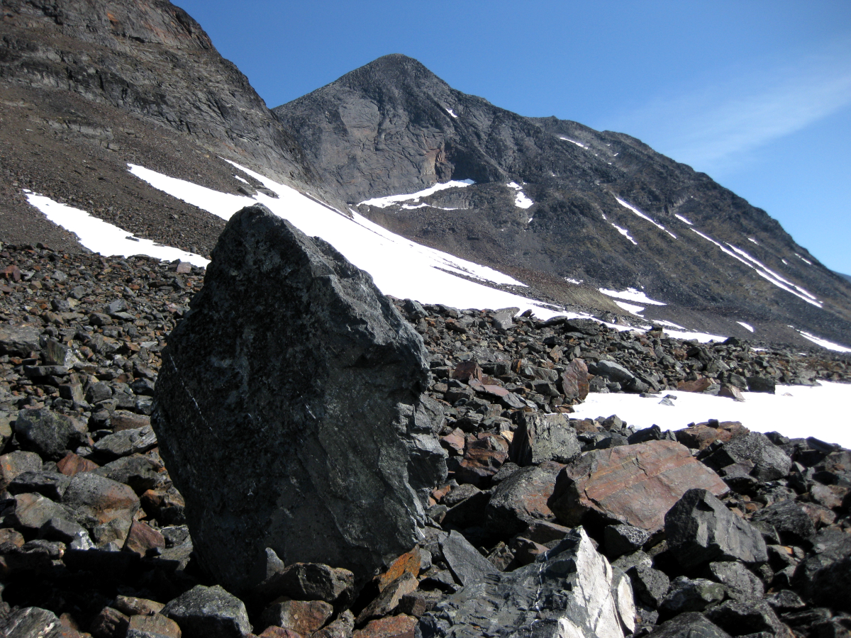 Ja, hur var det nu med stugvärdinnans råd att inte ta sig genom passet så här års. Både ock skulle jag säga. Tog lite tid då man fick vara mycket mer försiktig än vanligt. Snön bar bättre än väntat, åtminstone på förmiddagen. Den känsligaste delen var all lös sten och även stora block från lavinerna som inte var att lita på. De hade inte satt sig utan även stora block vickade eller rullade när man kom upp på dem. I kanterna på skreden var det också svårt att avgöra vad som fanns under snön, sten eller tomrum. Var det osäkert fattade jag vandringsstaven på tvären för att kunna bromsa ett fall i ett hålrum i snön. Men som sagt, allt gick bra utan att ha passerat det här passet tidigare. Med försiktighet och tålamod ordnar sig allt, fast i dåligt väder hade jag nog övervägt att vänta in nästa dag.