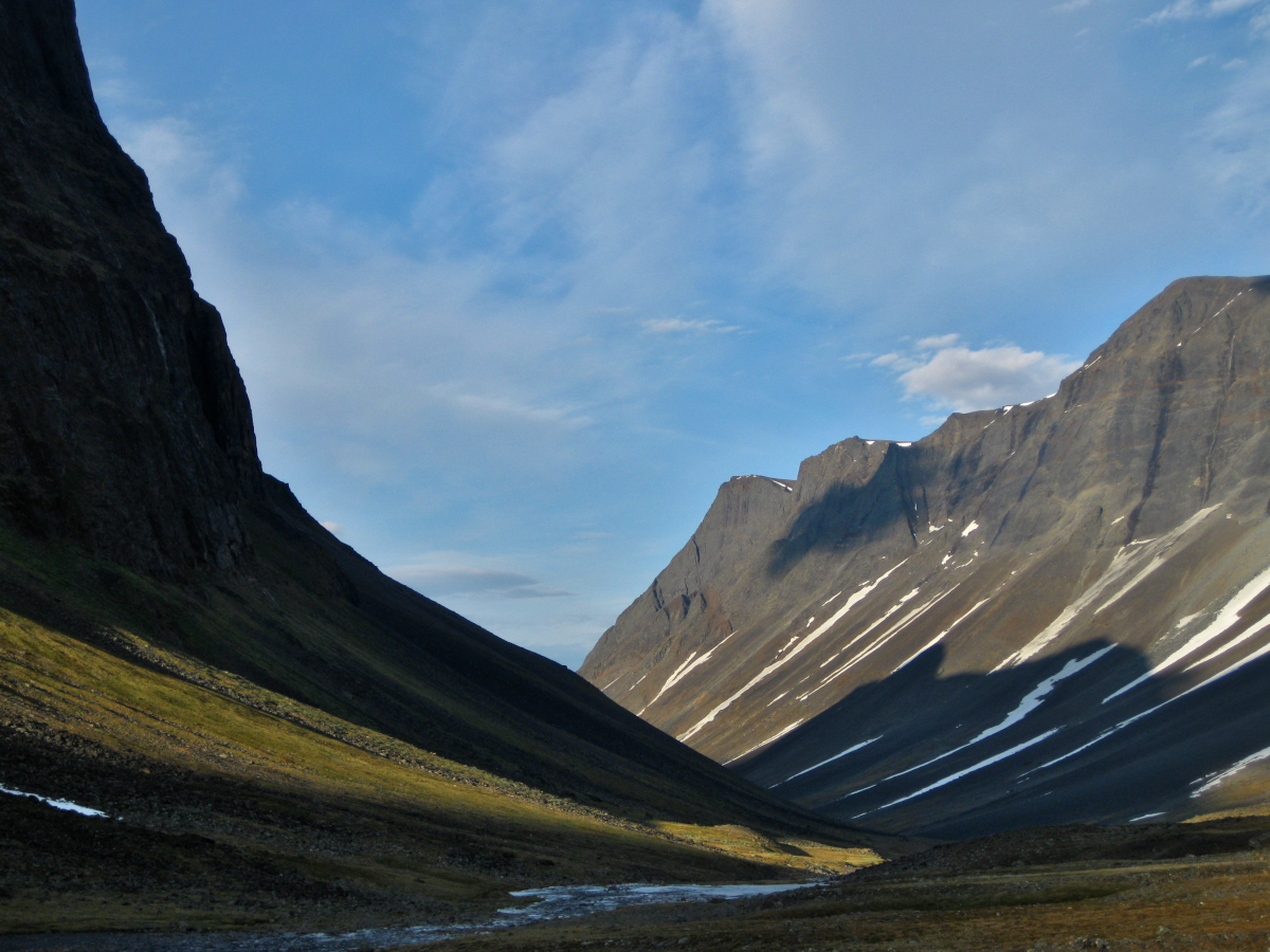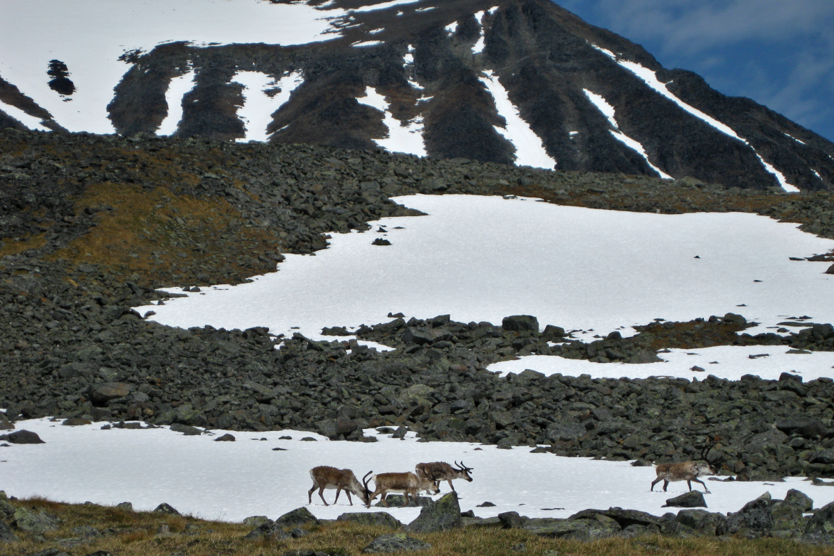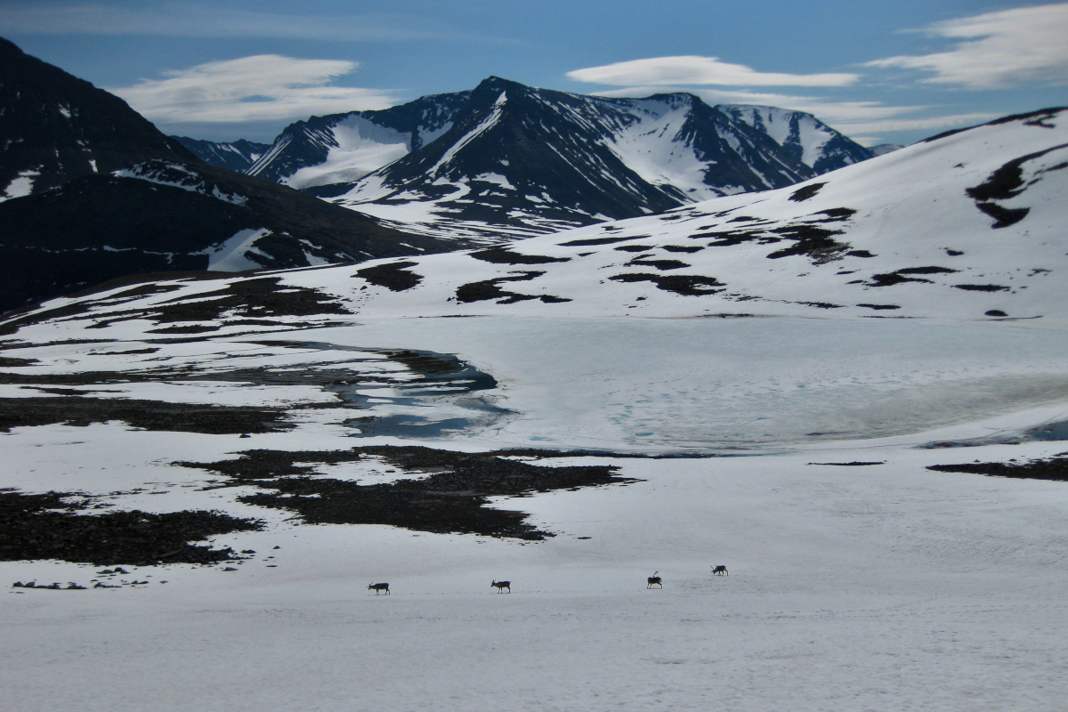 ”På en avsats före den sista utförslöpan på snö ladda jag om med nötgodis och dricka, med bar överkropp. Solen var grymt intensiv i kanten på snön och i lä. Längst ner på snölegan låg fyra renar som mycket motvilligt reste sig sen när jag kom nerglidande på kängorna. Fast och tjock snö i branten till skillnad mot västra delen av passet. Ett par rasbranter återstod, mestadels mindre vassa sprängstenar från laviner.”