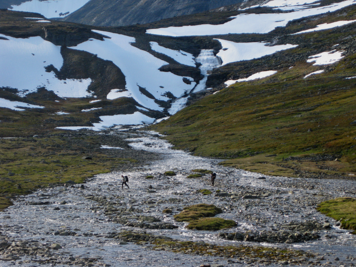 ”Pausa efter att ha hoppat över den första bäcken lätt. Ett brett stråk hade öppnat sig i snön, men vattennivån var låg. Fortsättningen upp till passet förbi issjön gick bra. Tog en brant snölega på skrå utan problem”.