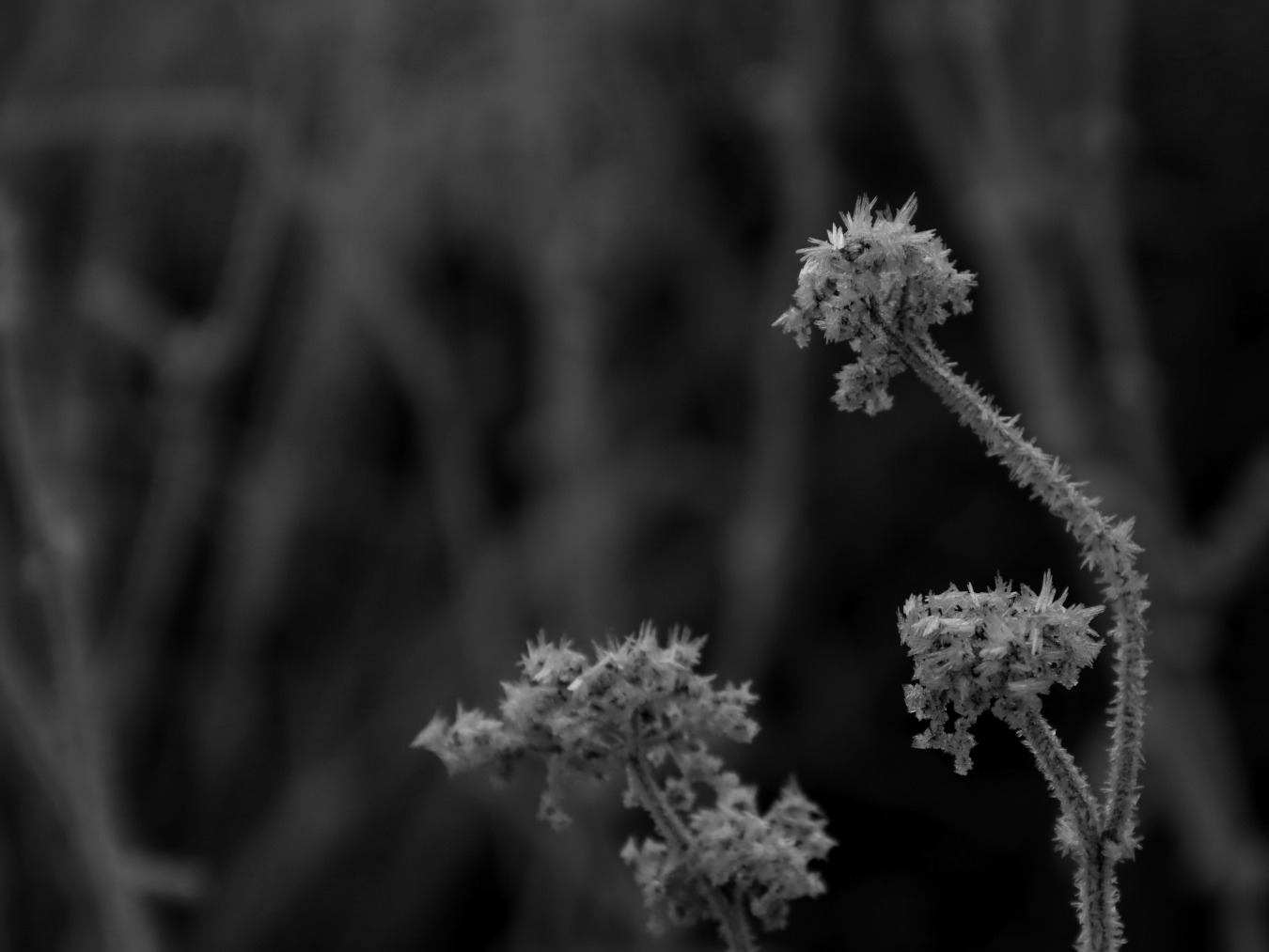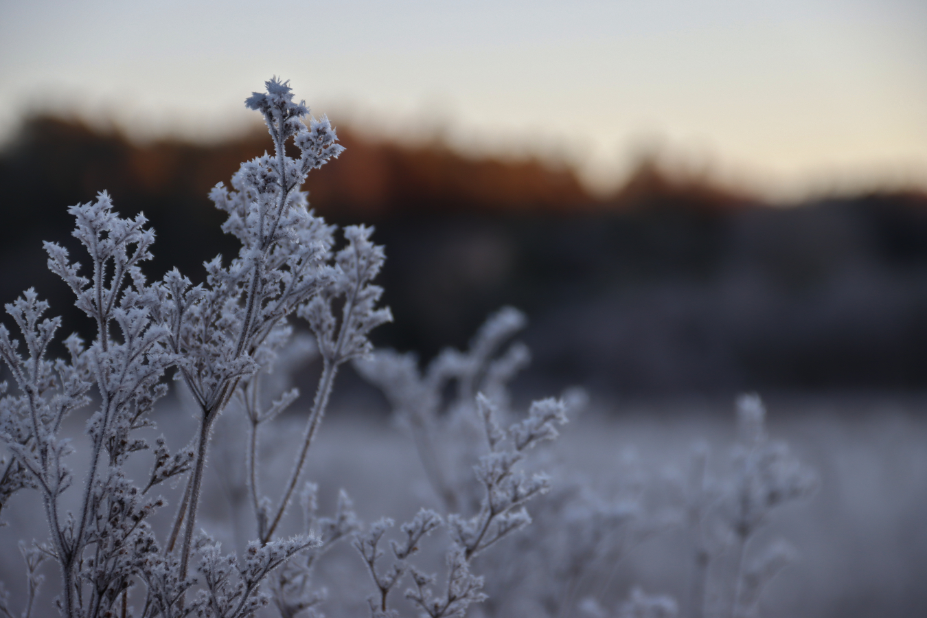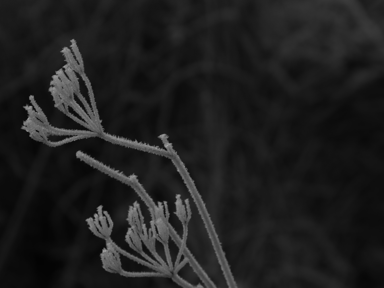 Koll på termometern i gryningen, -4 grader C. Första frostnatten i höst med lite högre luftfuktighet. Klev ut på en äng i stadens utkant och bländades av ljuset, trots att det nästan rådde mörker fortfarande. Hela landskapet återspeglades i grå och vita nyanser.