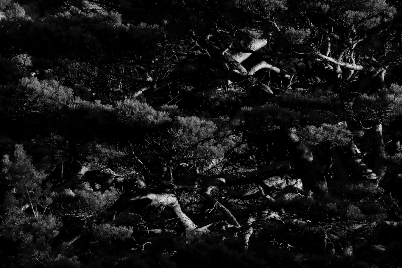 Villkoren är stenhårda ute i det yttersta kustbandet, oavbruten vindpåläggning över klippor, hällar och berg, mellan skrevor och in i minsta glänta. Inget levande lämnas oberört. Sammanbitet trycks de ned, söker skydd, försöker hitta en fast plats. Samarbete gäller bara om utrymme och livsvillkor räcker till.
