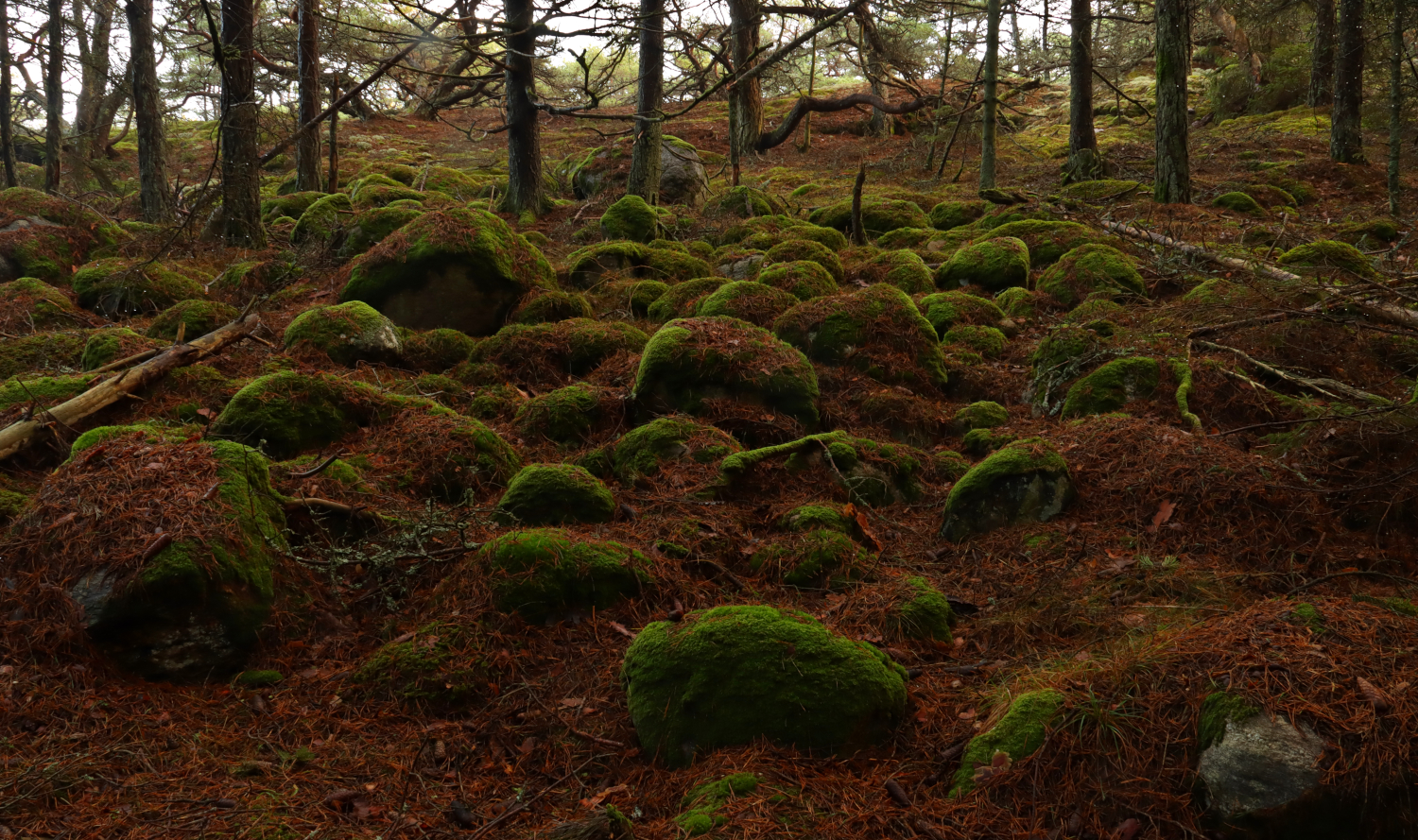 En 2 km lång stig (se karta) leder genom halvön, huvudsakligen i s.k. kusttallskog av varierad form och storlek. Ön hyser också en del ädellövskog, huvudsakligen inplanterad, men också gran och en förutom de vanliga lövträden. Vill man se helheten får man klättra lite i berg och på klippor, balansera på sten längs stränderna eller halka omkring på mossiga klapperstensfält. Men mer om det i kommande inlägg.
