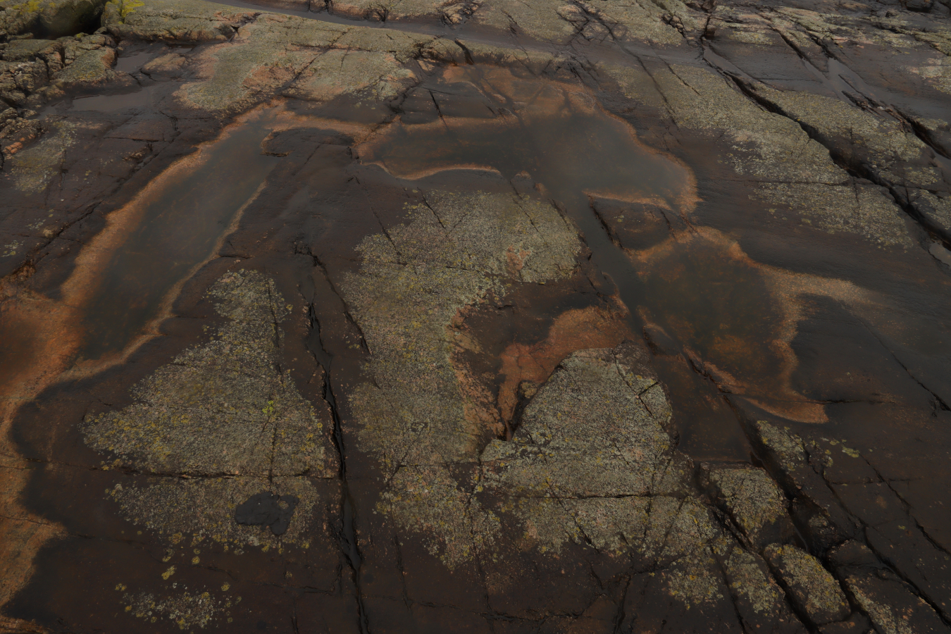 Isräfflor och jättegrytor hittar man ofta på klipporna, vilka utgör spår av istider. Tyvärr hittar man fortfarande också uppspolade rester av oljeutsläpp från tankers. På de flacka och grundare delarna, bildas hällkar med vatten, med egna ekosystem beroende på salthalt och vattenståndets påverkan. Mineraler löses upp och vattnet färgar klipporna. Sand tillförs från djupare partier vilket gynnar små blötdjur, snäckor och strandalger.
