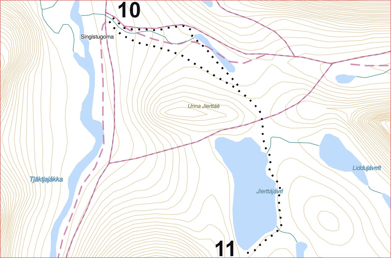 ”Tog det lugnt på leden upp till den första sjön. Vek sedan av upp i ett pass och sedan ner till den stora sjön Jierttajavri (889 m ö h), på dess norra sida. Tre tältpar höll på att packa ihop när jag kom upp vid 11-tiden. Blåste från sydost och duggade fortfarande sporadiskt. Sjön var stor, ca 3×1 km. Västsidan var brantare men jag valde den östra då den gav lite lä. Stränderna var inte speciellt djupa.”