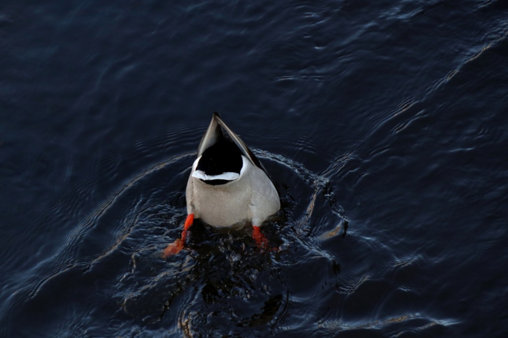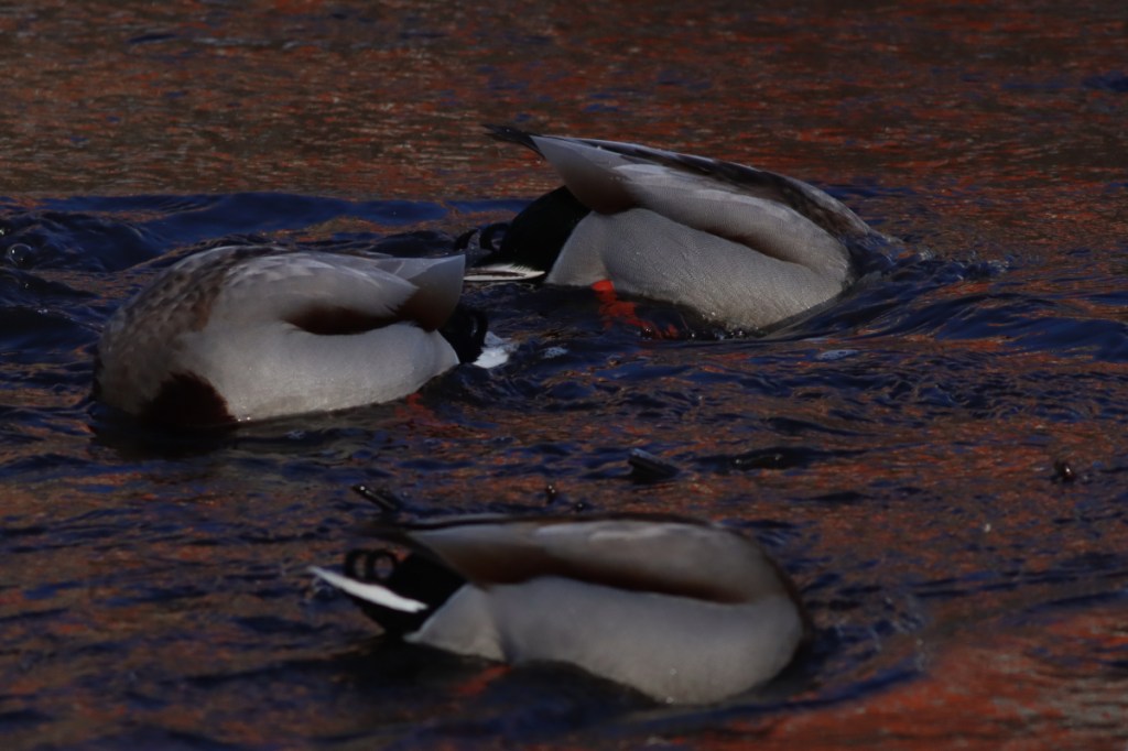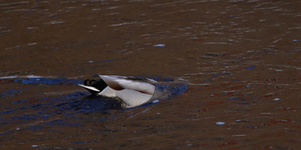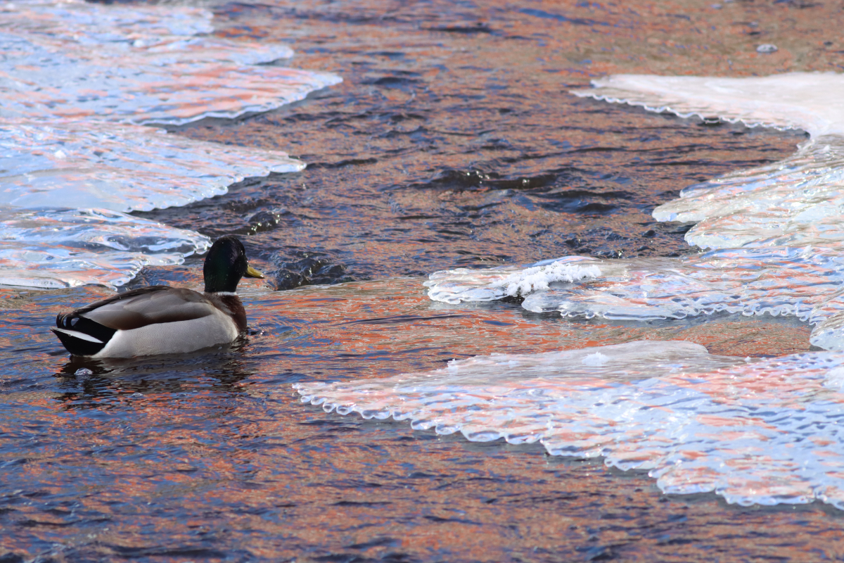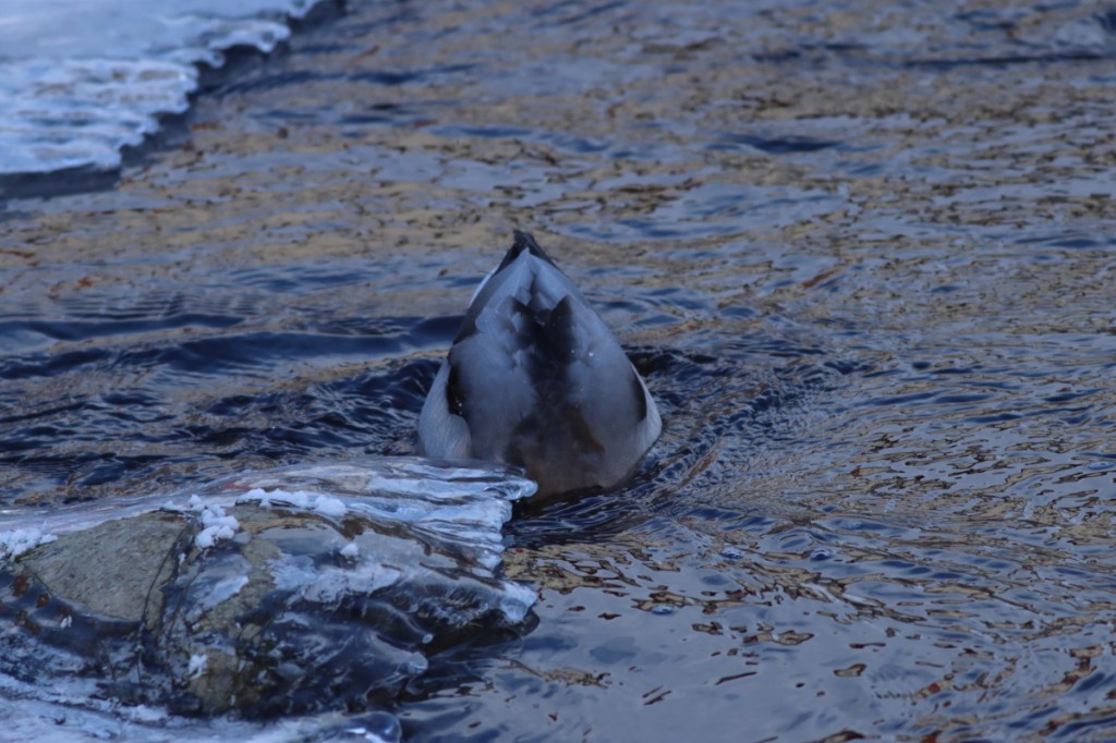 Gräsanden manövrerar skickligt mellan isklädda öar i strömmen. Fjäderdräkten är så tät att vattnet glider av efter varje dopp. Kan dock inte sluta tänka på hur de ändå måste påverkas av den låga temperaturen. Allt betande mot strömmens riktning, ser ändå ut att påverka den glesare fjäderdräkten ovan näbbroten. Sliter kanske mot vattenvegetationen och är svårare att putsa ren. Gräsandens panna känns väldigt utsatt i alla fall.
