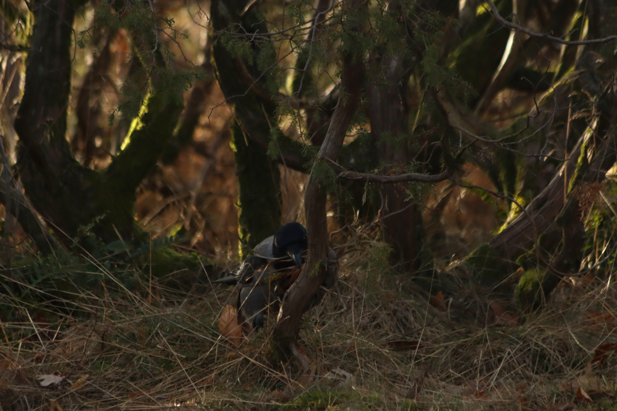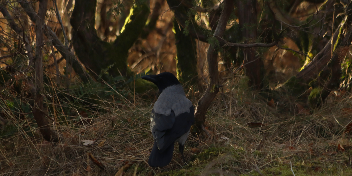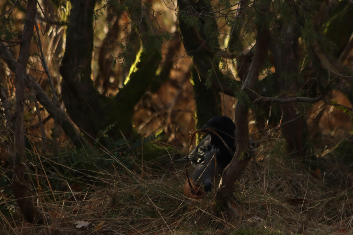 Paret kråka är mitt uppe i årets bobygge, borde snart vara klara men lite finlir återstår. Inne under en kraftig enbuske finns lösningen som binder ihop boet till en stabil konstruktion. Med hög precision tar kråkan tag i den lösa änden av enens trådlika bark och river av en remsa. Processen upprepas i snabb takt och strax är näbben full av sega och starka senor att tråckla med, så boet klarar vårstormarna. Den andra partnern rusar raskt fram för att inspektera materialet för godkännande. Sedan bär det iväg till en närliggande tät tall.