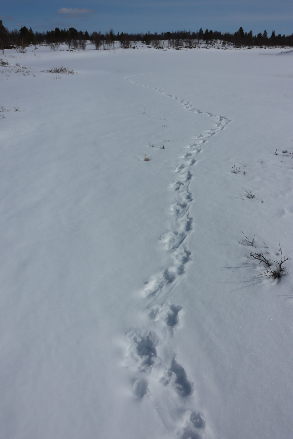 Lite längre bort, i kanten av myren, syntes det som om en flock renar trampat omkring i snön. Men, det stämde inte riktigt. Vi hade inte sett en enda ren under veckan, de flesta borde vara på väg västerut nu. Tog mig närmare kullen på den mjuka skaren. En smal, delvis öppen bäck från myren, stoppade mig. På andra sidan fick jag en förklaring. Vältrampade stigar till de lägre bestånden av fjällbjörk med släpspår som slutade mitt på bäcken. Avbarkade grenar och kvistar lyste vita i den mörka bäcken med ett litet dämme. Där hade bävern gått i vattnet. Ingen hydda fanns i närheten så troligtvis var det en hane som grävt ut en övervintringsplats i kanten av bäcken, nu väl dolt under snön.