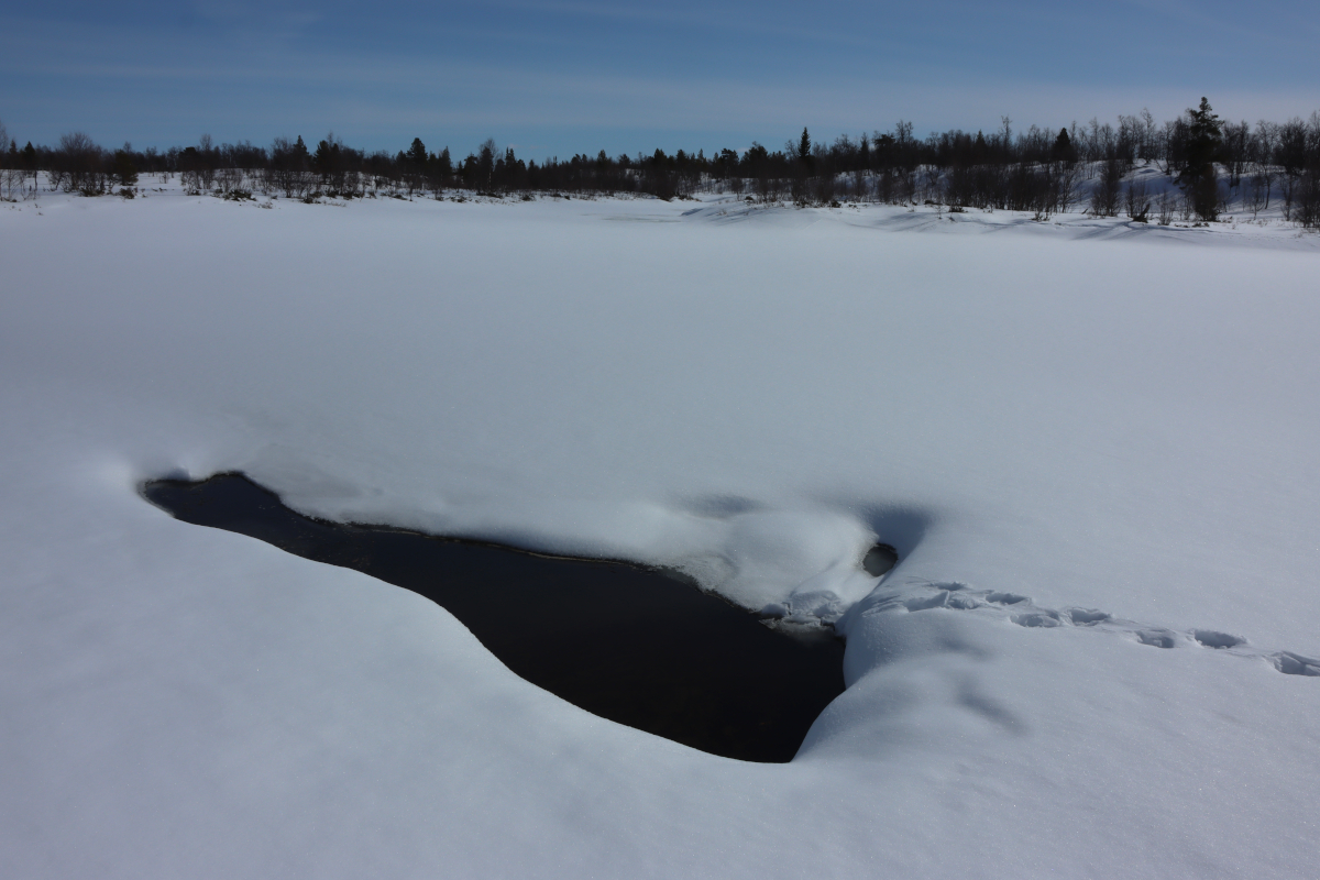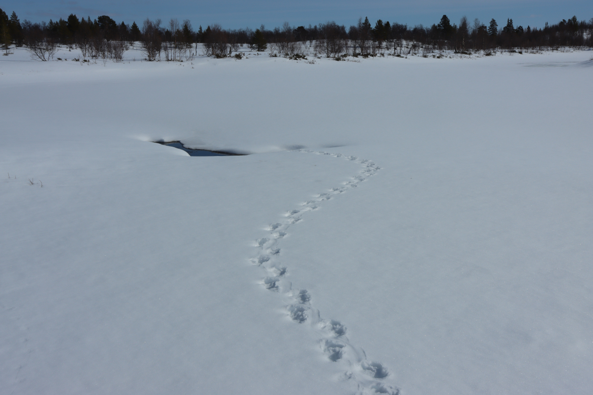 Bävern hade helt klart vaknat lite för tidigt eller så hade skafferiet blivit tomt efter en kall och snörik vinter. Färska gnag tydde på att det var dags att vårproviantera innan nästa köldknäpp. Med tanke på dagsmejan syntes spåren vara dygnsfärska. Väntade en bra stund för att se om det kom någon rörelse från bäcken, men det var helt stilla förutom ett svagt porlande över den lite slarviga fördämningen. I den helt snötäckta änden av bäcken fortsatte spåren, till synes oförklarligt ut mot den större frusna ån Mysklan. Följde efter och fann en grund öppning i åns tjocka istäcke. Där slutade spåren. Bävern hade helt enkelt slunkit ner under isen och syntes spårlöst försvunnen. På tillbakavägen kunde jag konstatera att det fanns relativt färska spår på åns andra sidan vid en öppen fors. Den måste ha simmat långt under isen, nyttjat små öppna luftfickor för att till sist hitta en säker plats som skulle vara öppen med bättre tillgång till lövträd. Tuff fjällbäver till nybyggare!