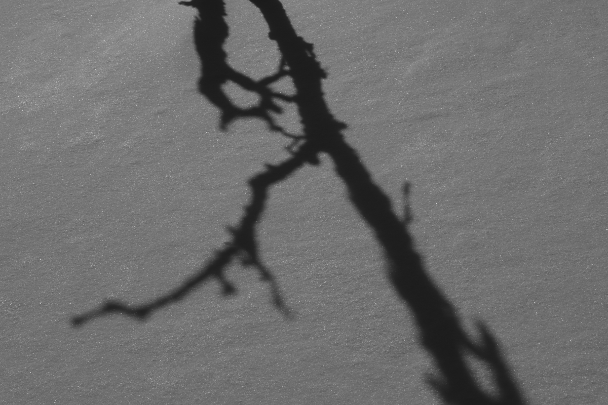 Snön är obeveklig i sitt sätt att återge trädens formspråk. Solen vandrar runt trädets axel, höjer och sänker sig, avslöjande trädets natur och alla dolda mellanformer. Först skarp vid stammens grund i marken, sedan långsamt utspädd i det hårt reflekterande ljuset för att lösas upp i toppen och ge snön en svag återhämtning. Spår av levande som rör sig konstant. Tänk er hur snölandskapet skulle se ut om jorden stod still ett par timmar mitt på dagen…….