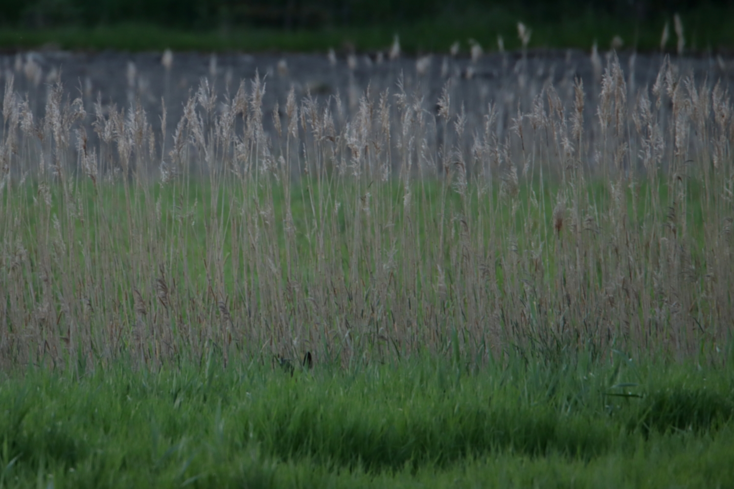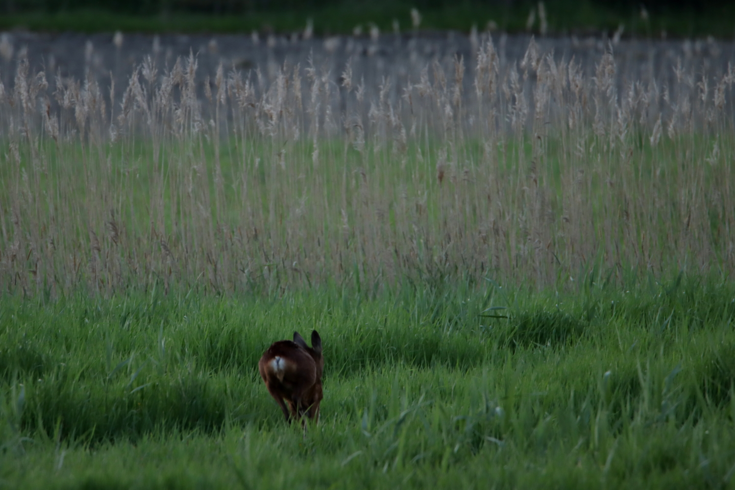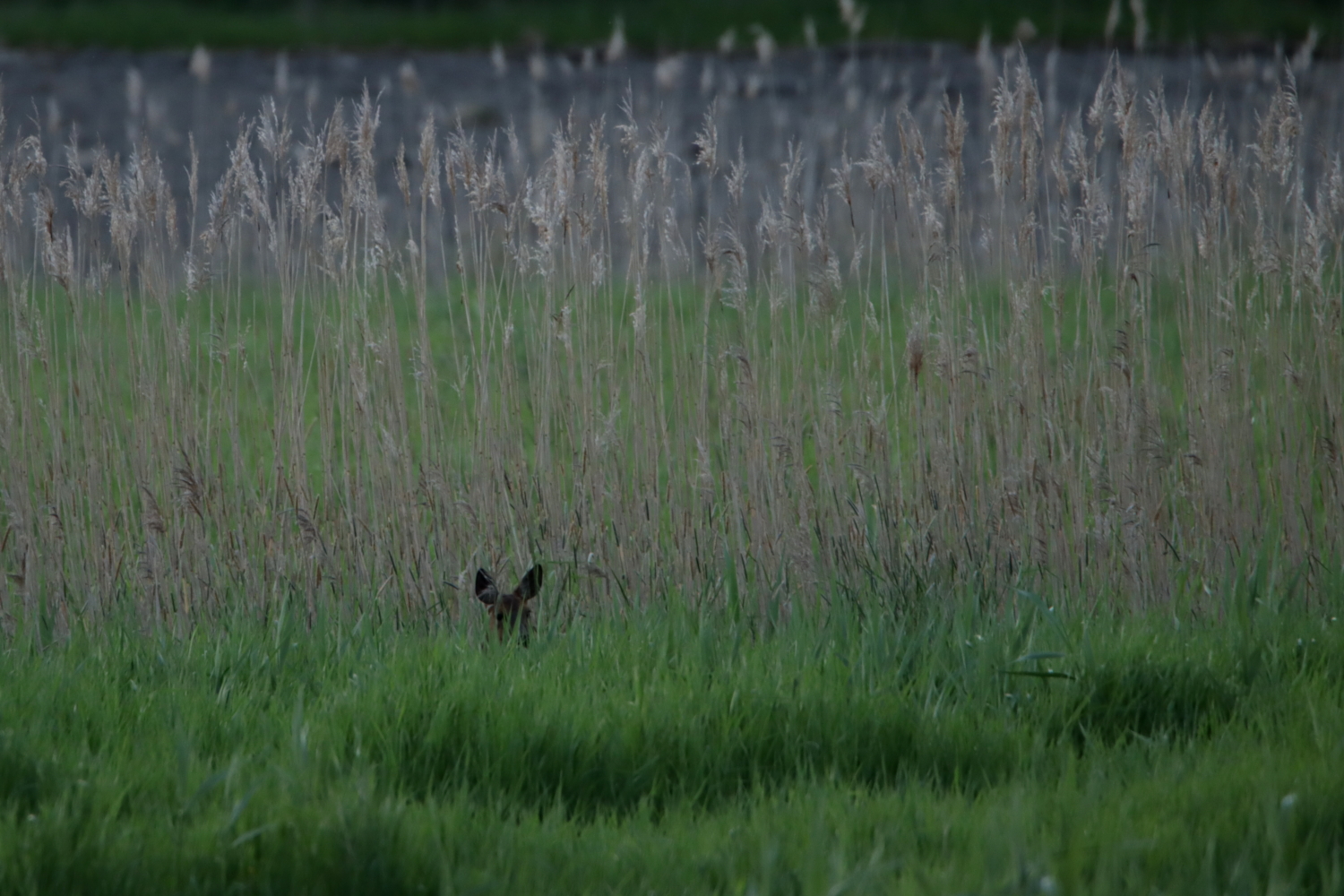 Vad är det som lurar i vassen? På hemväg vid 10-tiden på kvällen gick solen ner i tunna slöjmoln och det varma ljuset försvann direkt. Kanske det var det som gjorde att ett par mörka långa öron syntes tydligt mot fjolårsvassen. Hon reste sig strax för att lystra efter okända ljud från grusvägen, spanade mellan färska vassblad och vände sedan baken till. Ett skyggt rådjur, kanske en hona i väntans tider. Snart midsommar, då får vi kanske se.