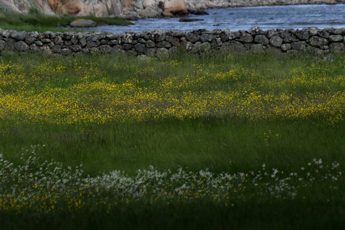 Utan får och hästar vilar ängen denna försommar, återhämtar och breder ut sig i välbehag. Passar på att sprida sina frön i sjöbrisen från havet innan den åter blir en fristad för betande tamdjur eller naturvurmare med filt och picknickkorg. Vilsam är den för öga och kropp.
