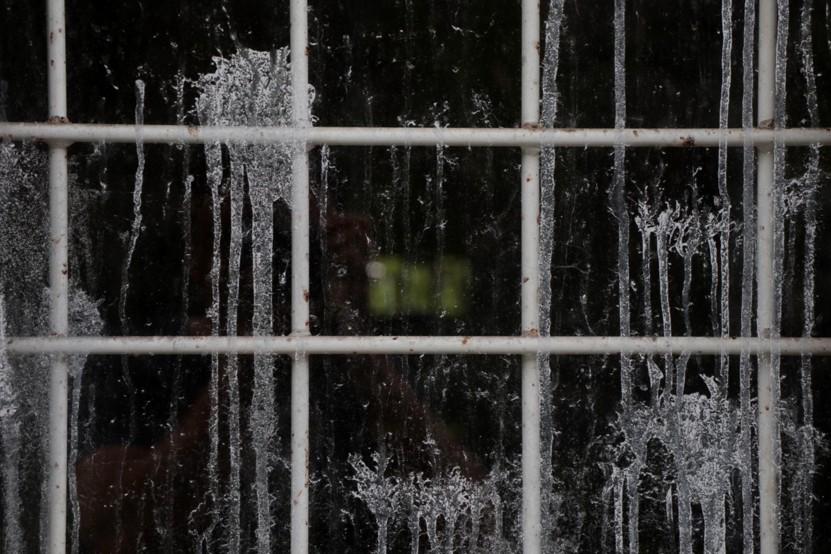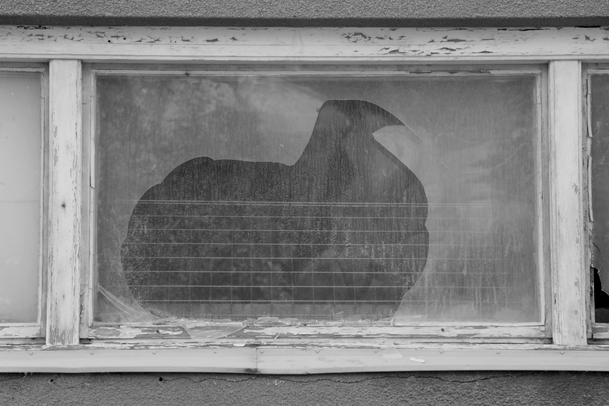 Den ruvande hönan och den ljust turkosa spruckna rutan med speglingar fångar mig här.