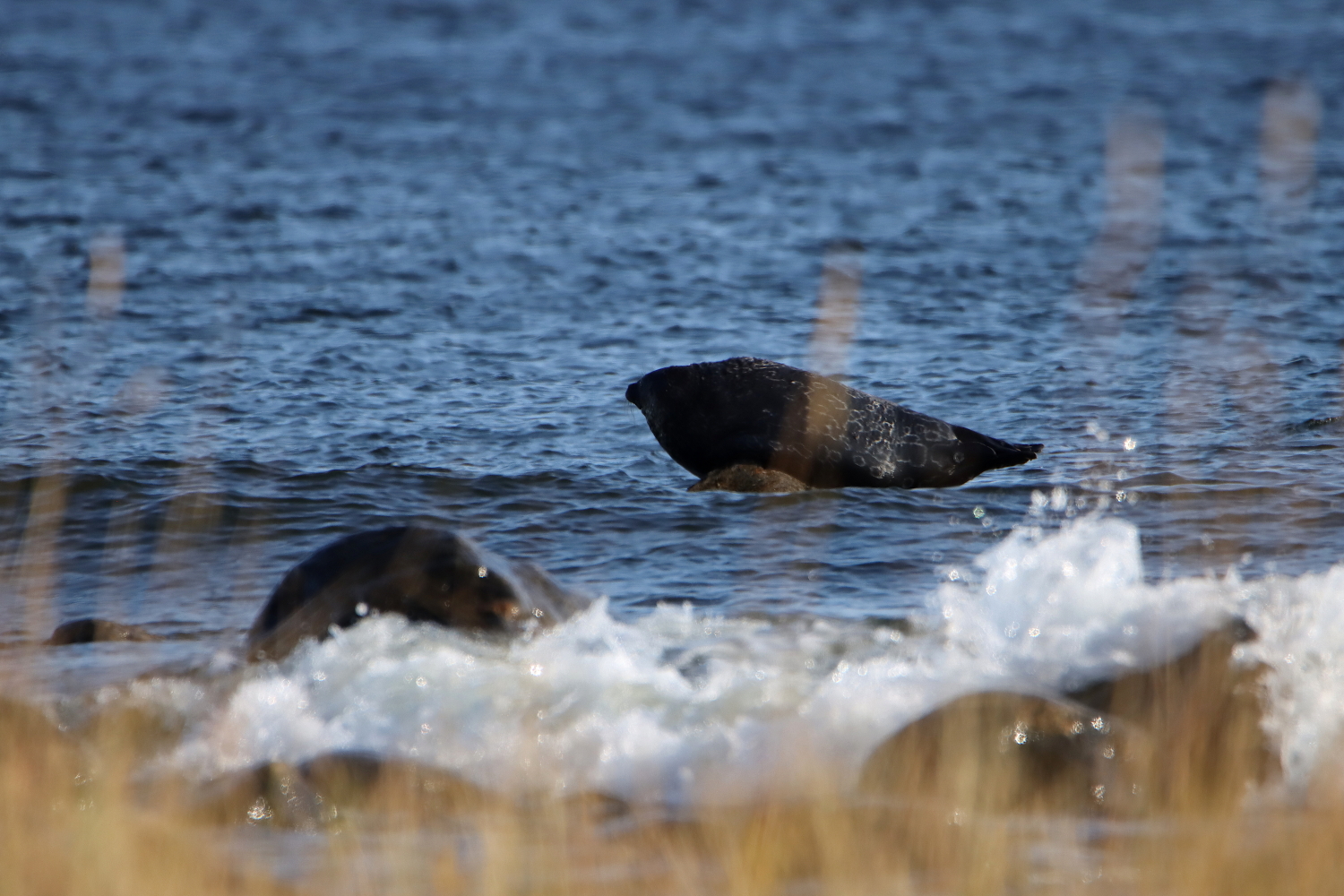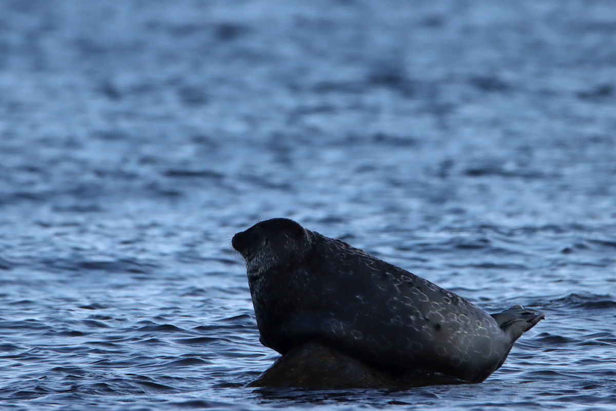 Helt nära land fanns en annan mer hemtam art, typisk för Bottenvikens mer bräckta vatten. En vikarsäl (Pusa hispida) hade förankrat sig på en spetsig sten utanför läsidan med betydligt lugnare dyningar. Den lät sin graciösa kropp omfamna stenen och syntes inte ha några problem med det knöliga underlaget. Även om vikaren ibland lättade något när sjön steg och fick parera med labbarna. Hade detta varit ett foto på Instagram hade säkert kommentaren varit ”Hej då” på första bilden istället. Ja, vikaren försvann faktiskt ner i havet strax efter.