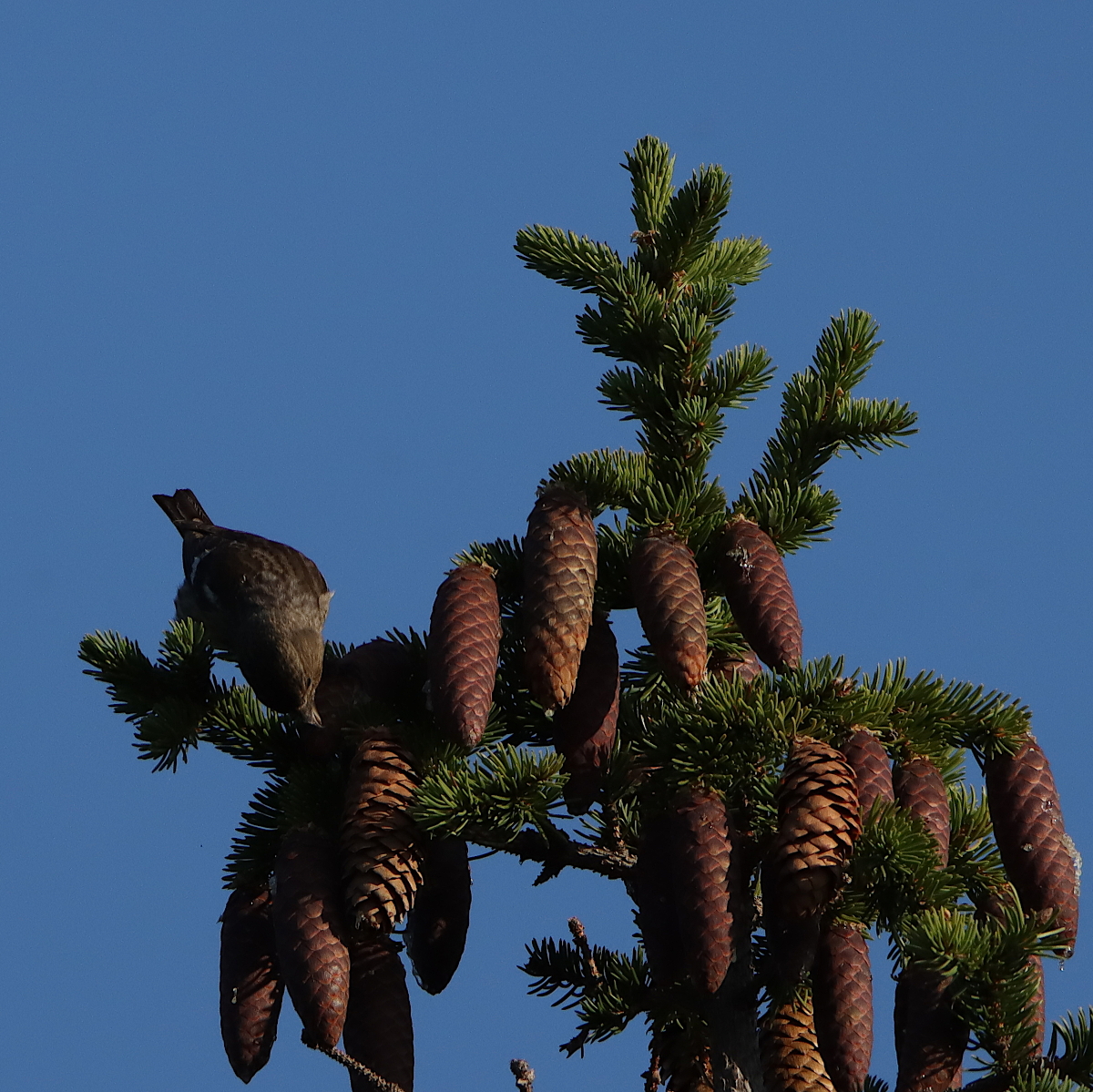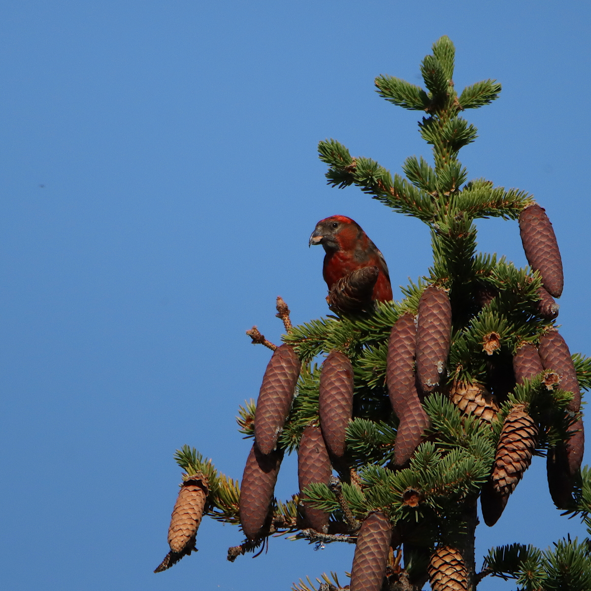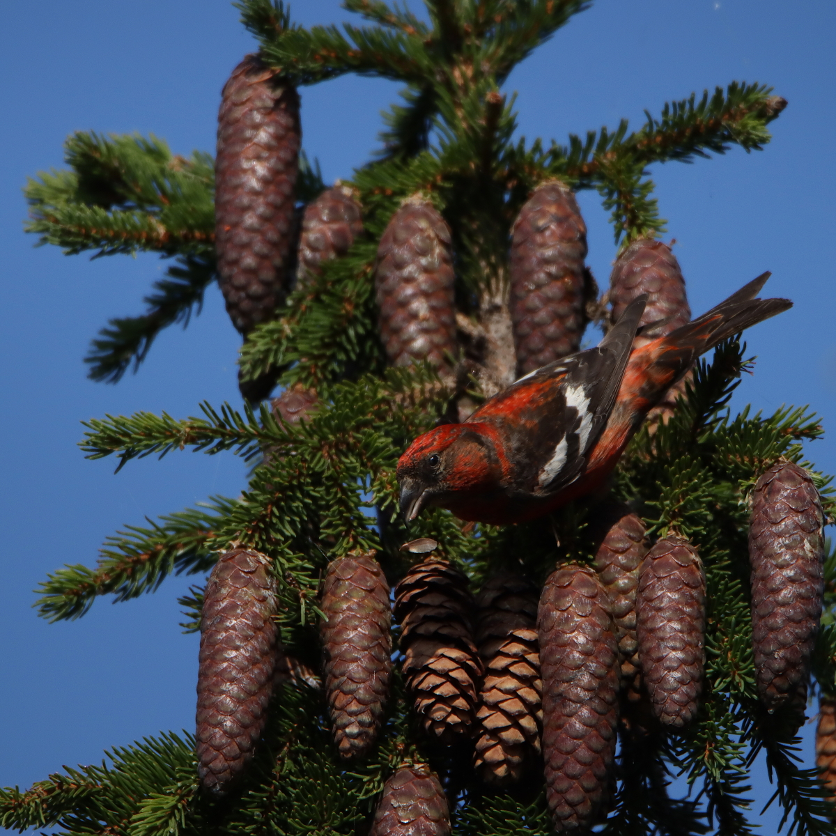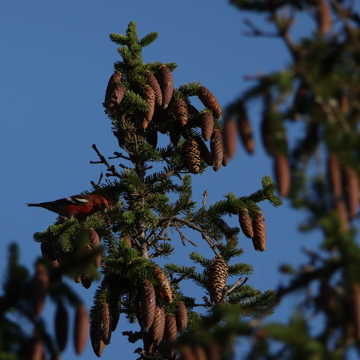 Hanen sparar inte på grannlåten, nästan självlysande röd och glänsande i solljuset, även mitt på dagen. De skannar av topparna på de bästa kottarna som börjat öppna sig, bänder ut ett frö, tar smidigt bort fröets vinge och behåller den energirika godbiten. Ratar vissa som inte har rätt mognadsgrad antagligen, eller så är de bara slarviga av allt överflöd.