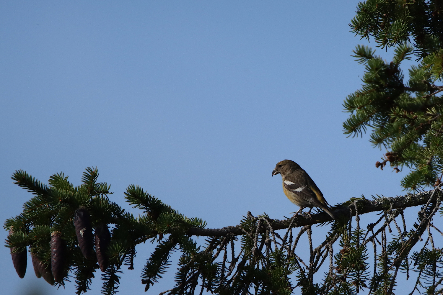 Bland granarna dunsade det till ibland. Runt mig ramlade det ner grankottar då och då. Vi hade sett dom några gånger men denna sista dag hade de fullt upp att plocka ut de fina fröna ur kottarna. En flock på tolv bändelkorsnäbbar (Loxia bifasciata) rörde sig ivrigt i grantopparna, både hanar och honor samt de snarlika ungfåglarna.