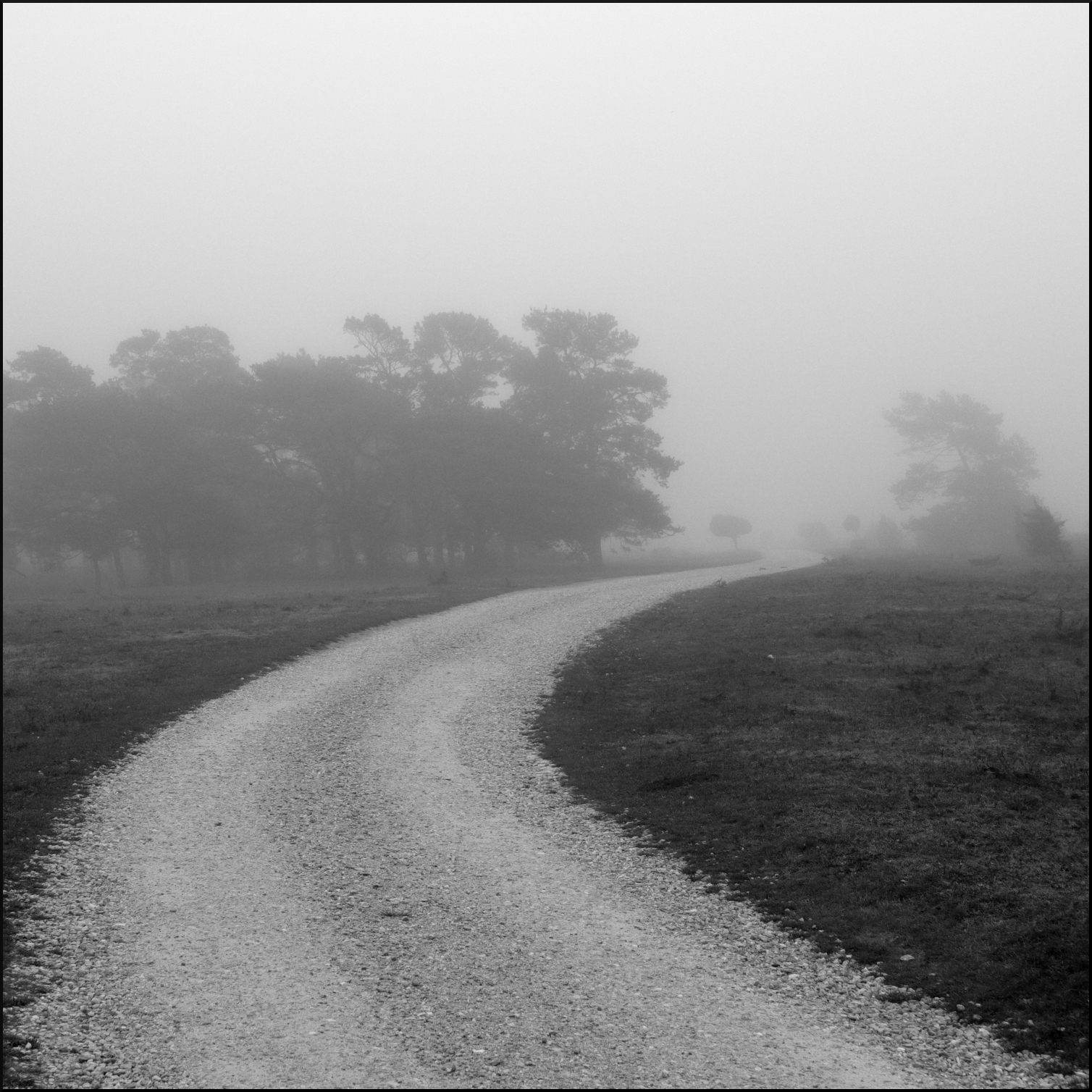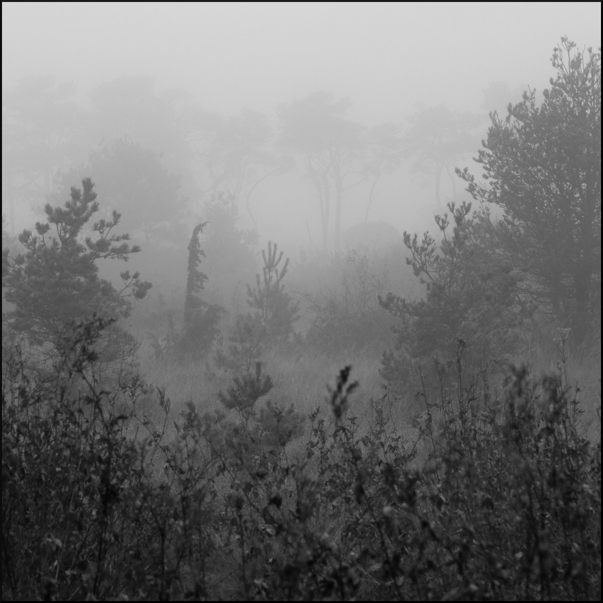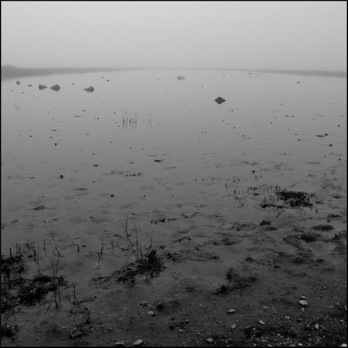 Tystnaden förstärks i dimman, avstånden bleknar och man är bara sig själv i ett landskap av kulisser. Havet gungar in mot stranden, änder tränger fram men syns inte. Vandringen längs stranden, runt avsnörpta saltsjöar och i tång eller strandväxter, väcker upp eller stör några som försöker hitta frukost eller sig själva. Det långa teleobjektivet gör ingen nytta, det är knappt strandpipare och ljungpipare framträder ur dimman längs vattenbrynet.