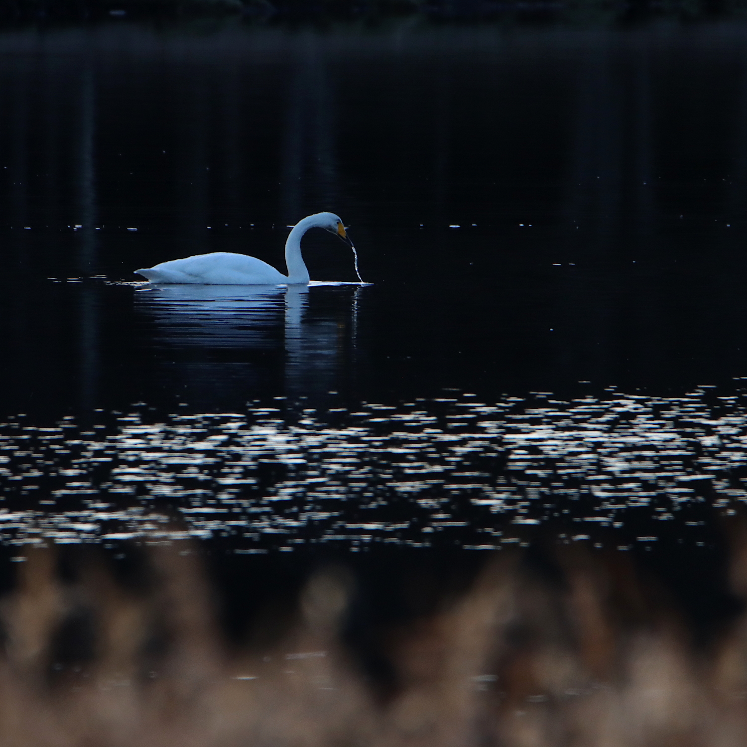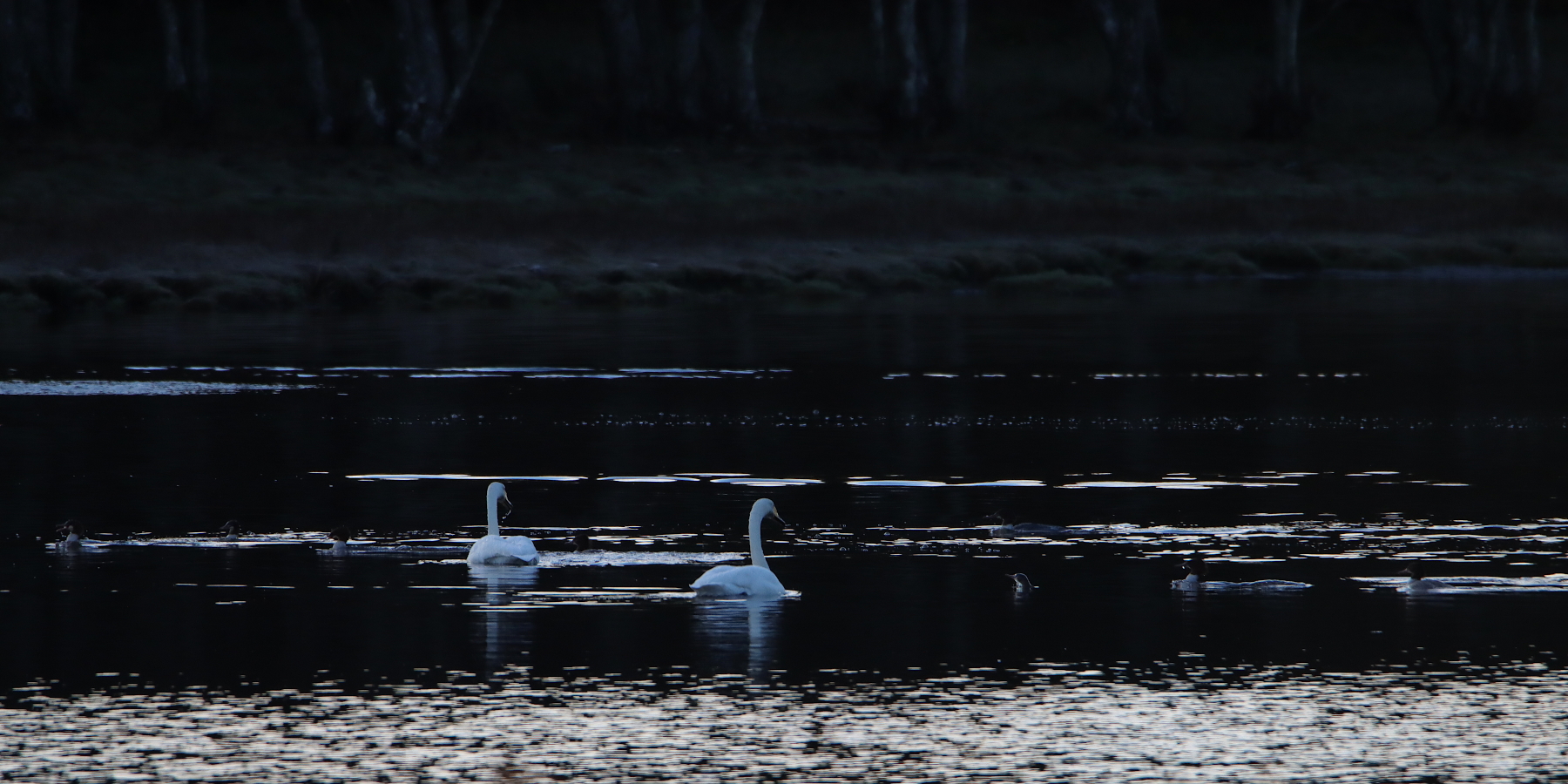 I den grunda och skyddade havsviken finner sångsvanen (Cygnus cygnus) ro på sin sena flytt från norra skandinavien. De stannar gärna till några veckor på en bra plats där de kan äta upp sig inför sista etappen söderut. Fotografen i fågeltornet stör inte men en flock snorklande storskrakar (se tidigare inlägg) däremot. De väjer inte, utan simmar rakt igenom gruppen av sångsvan som något upprörda säger sin mening om tilltaget.