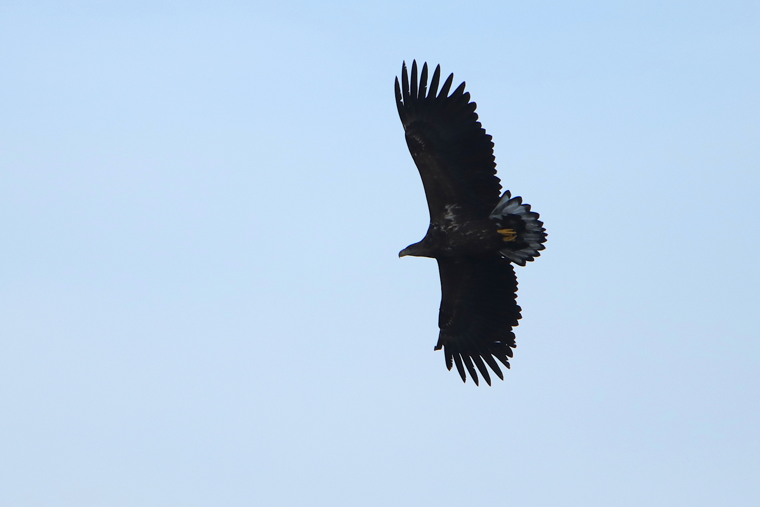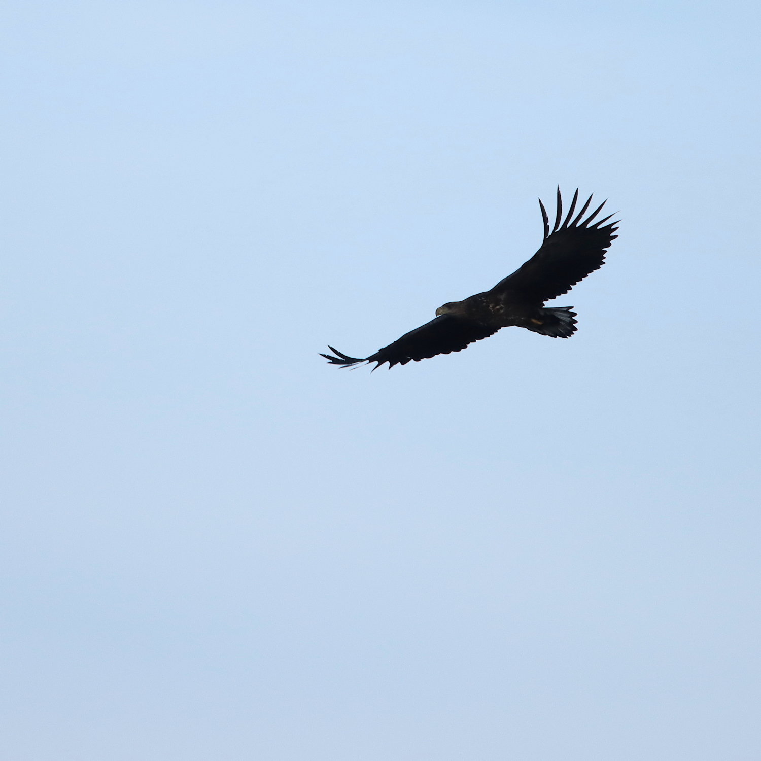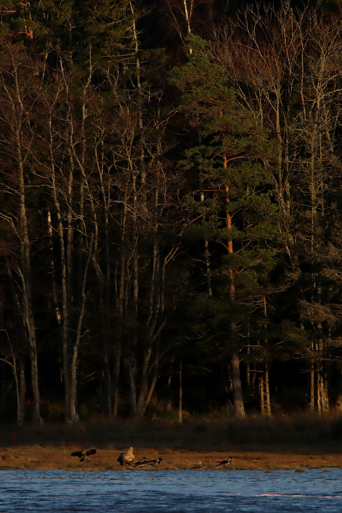Färdig efter ett tre timmar långt pass packade jag ner all utrustning i ryggsäcken. Då kommer den gamla havsörnen snabbt glidande förbi mig söderifrån i fin medvind. Innan jag fått upp kamera hade den hunnit över på andra sidan viken och gick ner, till synes utan anledning, vid stranden. Vilan blev inte lång när kråkorna hade upptäckt örnen. Motvilligt fick han luft under vingarna och tog sig mödosamt tillbaka i skydd av skogskanten mot den byiga vinden från havet.