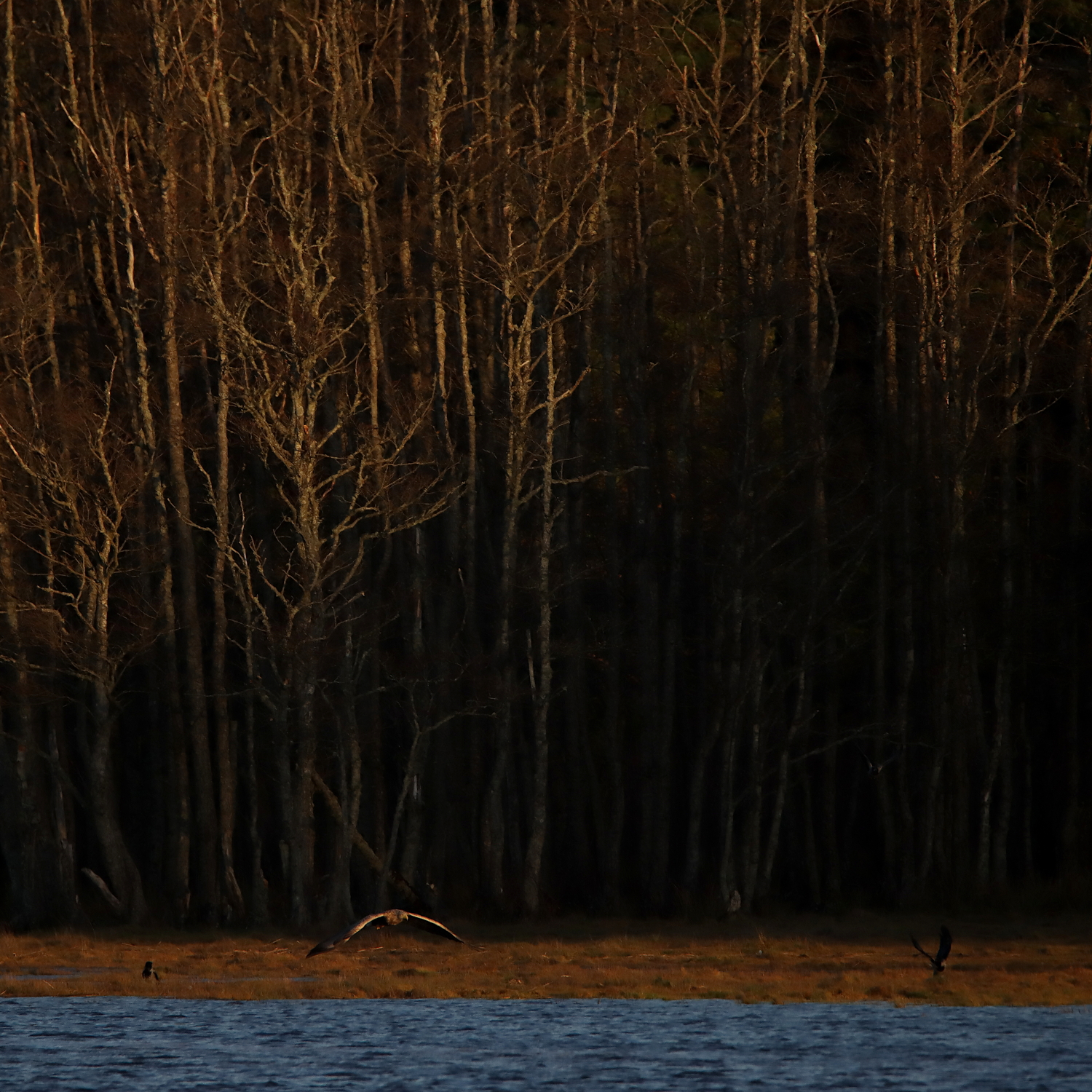 Det blåste en hård sydvästlig vind i havsviken. Vattennivån steg konstant under eftermiddagen. Så här i november händer inte mycket men längst in i viken satt en ung havsörn vid strandkanten. Lyfte efter en kort stund, påtagligt irriterad över alla uppvaktande kråkor. Svepte i motljuset snett förbi mig, spana titt som tätt efter någon rörelse i vasskanten och gick västerut mot vinden.