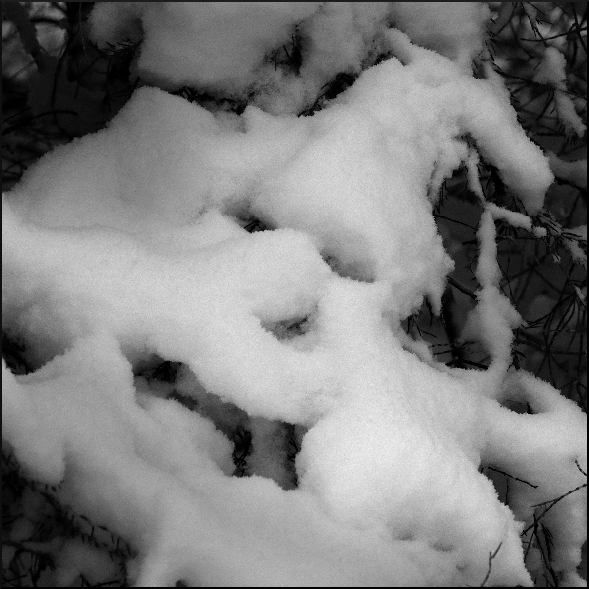 Och så kom snön åter och målade allt, täckte alla skavanker och lyfte fram konturer. Dämpad vilsamhet.