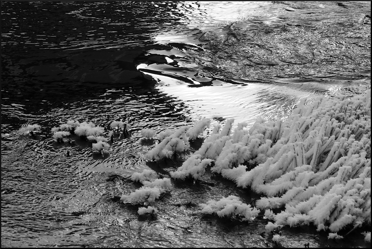 Som en invaderande armé av hattifnattar, fascinerande! Och ormbunksblad är alltid så dekorativa när frosten förstärker mönstren. Den översta bildens fuktmönsterbräda toppad av frost blir jag glad av.