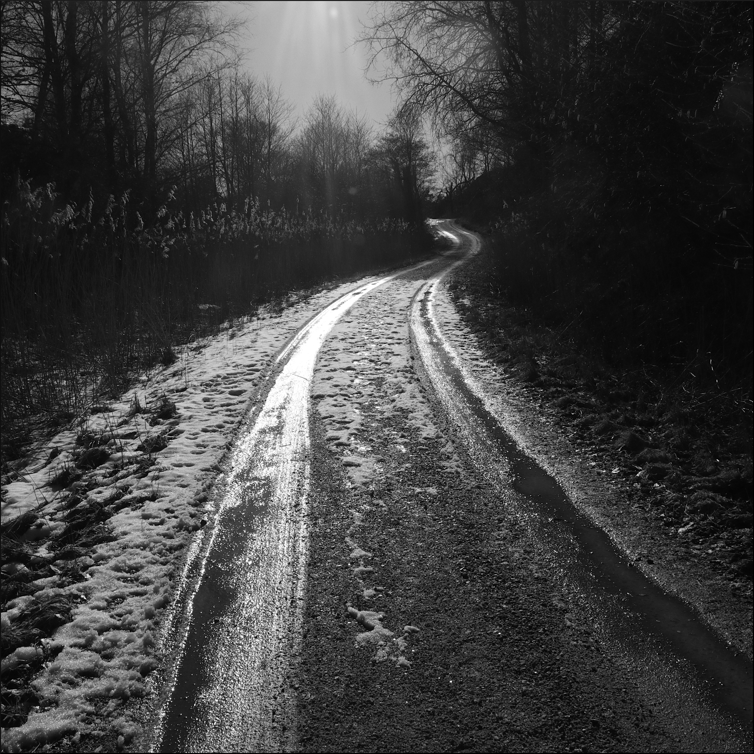 Snön för en omöjlig försvarskamp mot den allt högre liggande solen. Även om det inte är mycket snö kvar så är vätan påtaglig i skog och mark. Inne i skogen, där solen inte riktigt hinner bränna barfläckarna mer än en kort stund innan de skuggas, går det långsamt. Små bäckar försöker förtvivlat få undan vattnet mot torrare platser. Men överallt bland fjolårslöven väter det igenom efter mina fotspår. Grusvägen däremot torkar undan för varje timme. Skönt att slippa se var man skall sätta sina fötter utan att bli blöt och istället kunna fokusera på de tranor som drar norrut, högt över kraftledningar och mitt huvud.