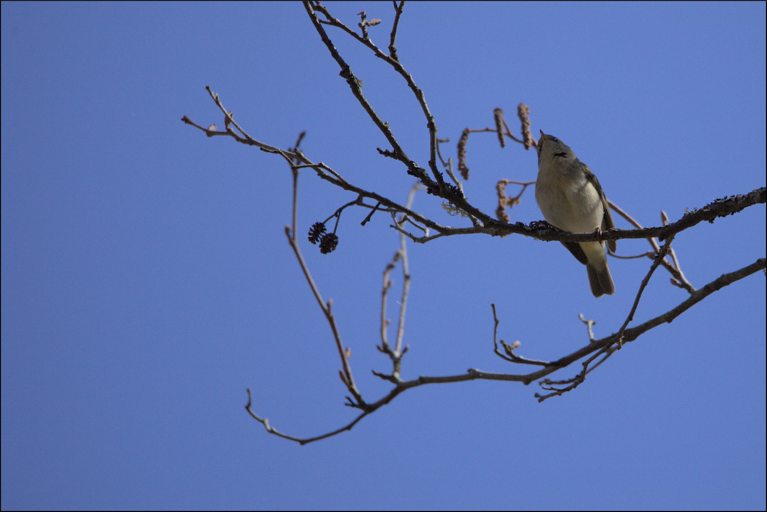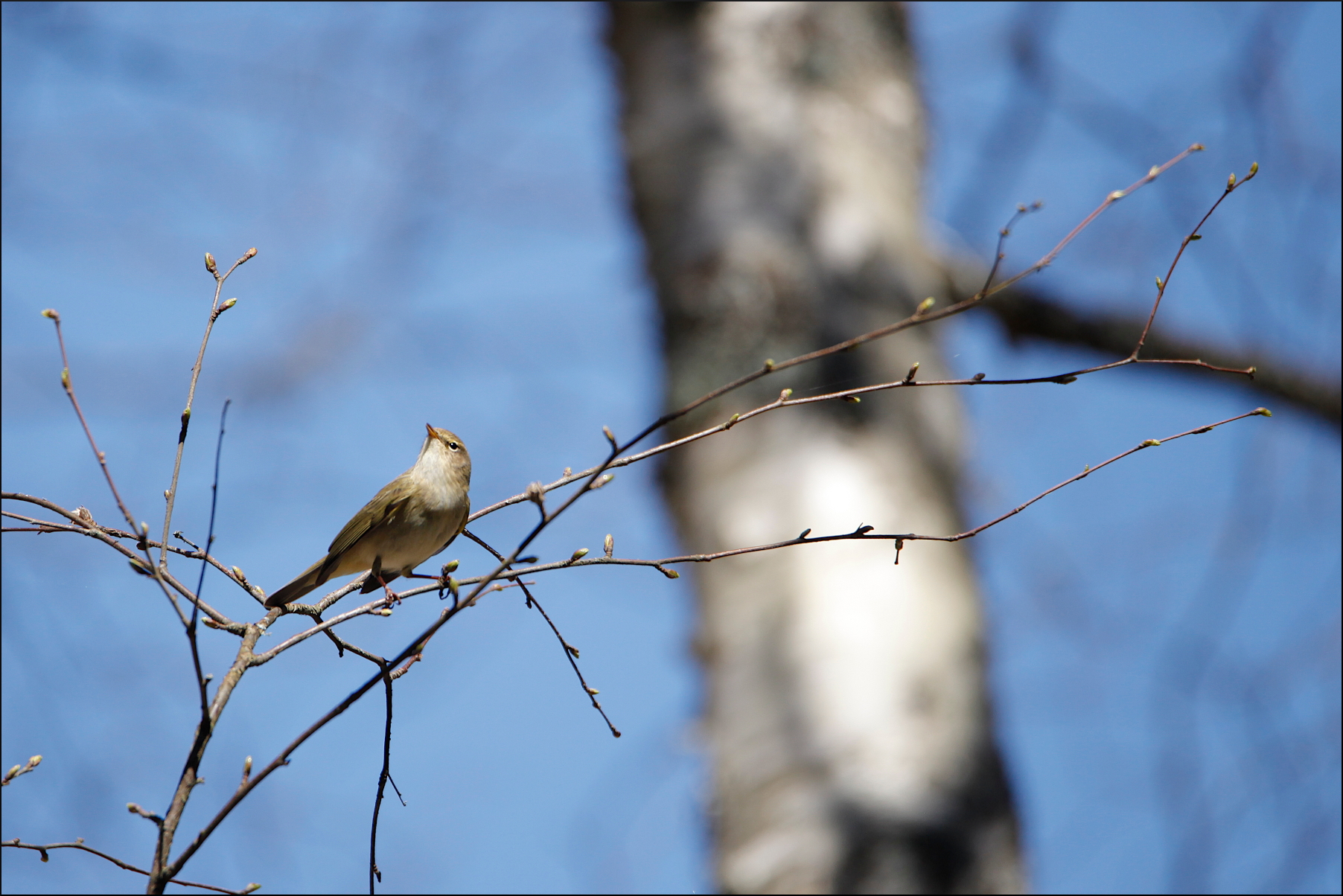 Denna varma vårdag, när björkens knoppar började lysa gröna i motljuset, skulle en gransångare luras. På 8-10 meters avstånd la jag min mobil på en trädstam. Satte på lätet av en gransångare på repetition och placerade mig själv i skuggan under en gran. Det tog bara någon minut så kontrade en något upprörd hane. Först dold i granarna, sedan mer synlig i de höga björkarna.