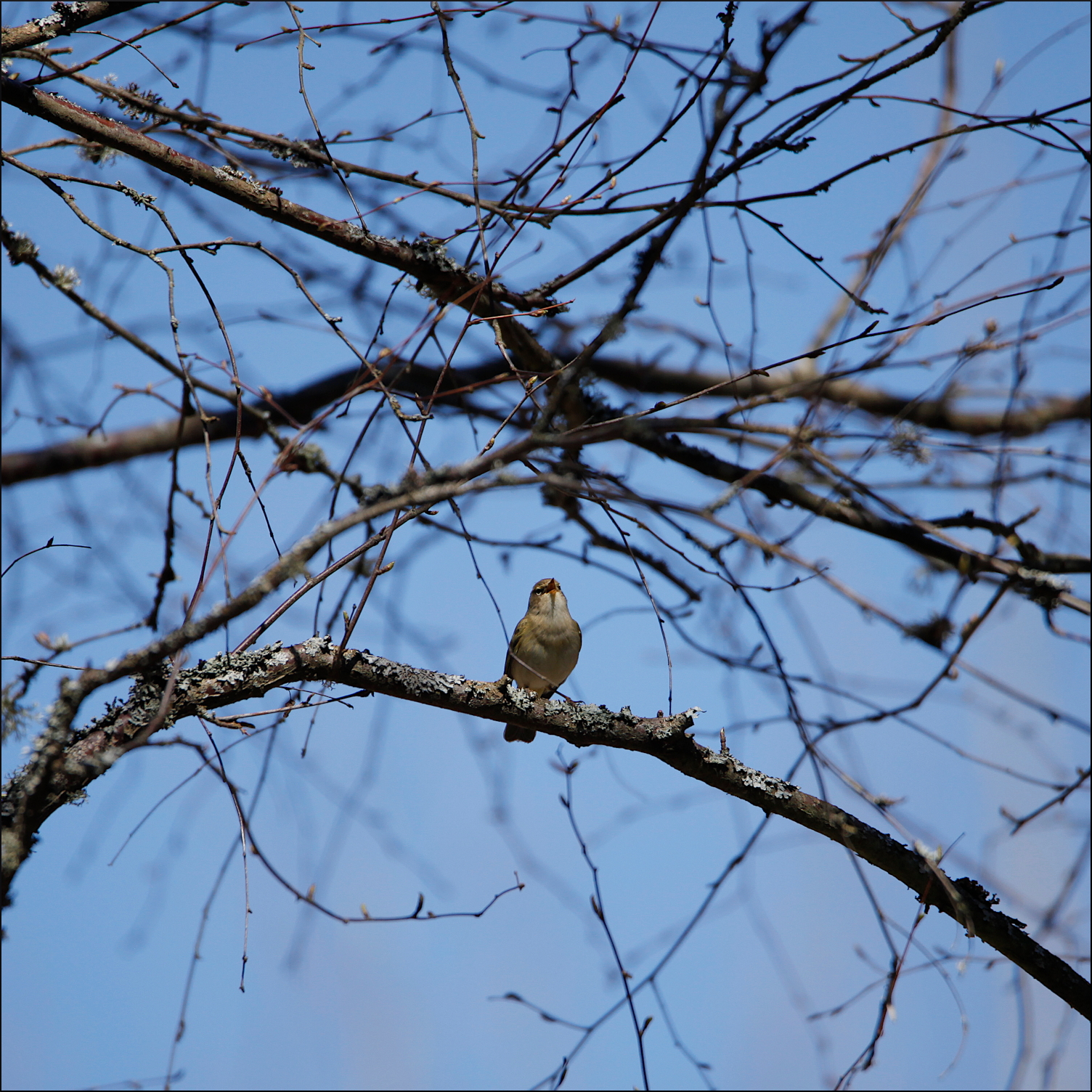 Han bytte hela tiden snabbt position för att försöka pejla in inkräktarens placering. Jag fick då och då en blick som både verkade nyfiken och undrande. Vad var det som pågick här i hans revir egentligen? När han till sist satte sig nästan rakt ovanför mig förstod jag att han förstod. Jag fick en blick (se sista bilden) som säger allt och avslutade mitt lurendrejeri så han kunde stressa av och som jag bara njuta av lövsprickningen.