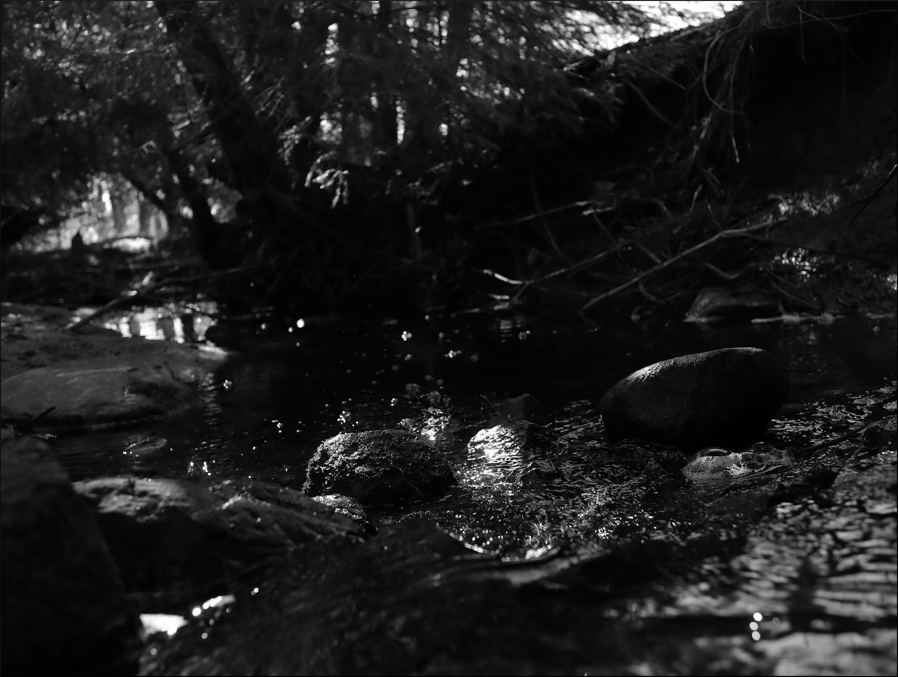 Blev sittande i slänten en stund och funderade över platsen. I den lugna delen av bäcken där den druckit var det svalt i skuggan under några granar, ovanför strömmade vattnet hastigt utför en mossbeklädd berghäll och kastade sig ner för ett litet fall uppbyggt av stenar i varierande storlek. Det skapade rörelser i vattnet som bara syntes när man satte sig lågt och tittade ut mot solgläntan bortom bäcken.