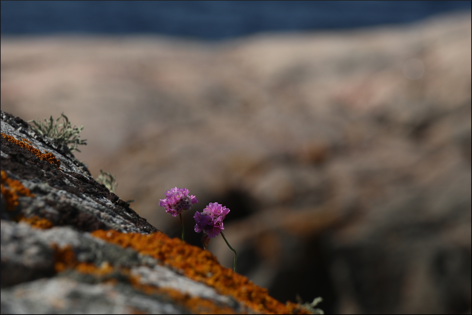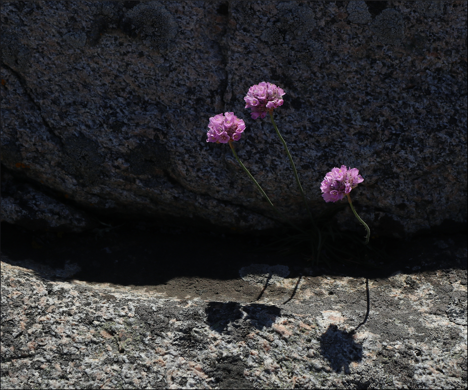 Den går inte att missa, vår Trift, en nästan självlysande rosa blomma på en kal stam. Snart lika självklar längs dikeskanterna på vägar som här vid havet där den hör hemma utan större konkurrens. För vem skulle kunna stå ut med hårda salta vindar, avsaknad av jord och mycket sparsam vattentillförsel. Det räcker med att titta på Triftens grannar, som huvudsakligen är lavar, för att förstå dess unika anpassning till sin miljö genom årtusenden av evolution. Här ute på de kala klipporna, där de få gräsytorna i sänkorna endast är någon kvadratmeter, får den ändå hjälp av humlor och några dagfjärilar att föröka sig.