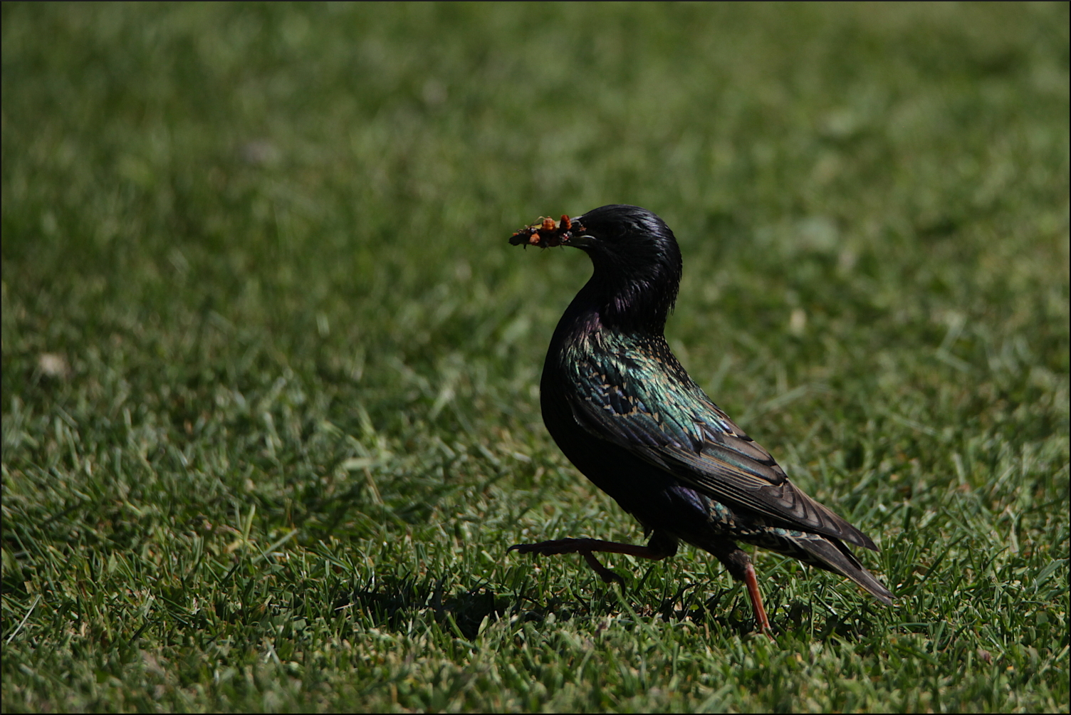 Denna dag hade flugbaggarna inte sin bästa dag. En stare återkom med jämna mellanrum när solen stod i zenit mitt på dagen. Jakttekniken var att springa ikapp flugbaggen, som bara lyfte en kort sträcka i taget. Staren hade inga problem att sörja för sina ungars behov, minst 5-6 flugbaggar lyckades den behålla i näbben vid varje vända den gjorde mellan gräsmattan och boet.