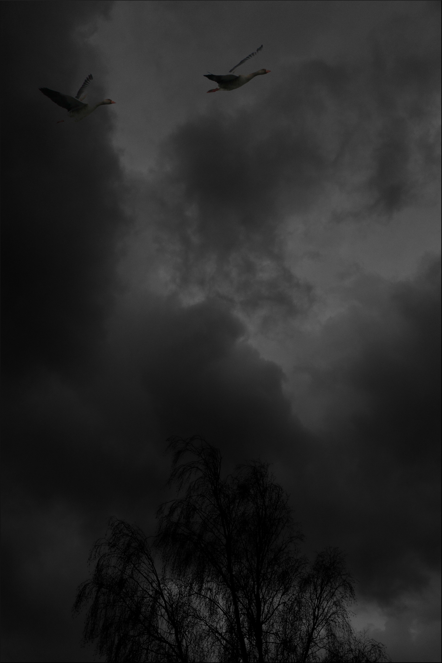 As I live on a hill in the middle of our small town, geese sometimes appear out of nowhere above our house. Tried to recreate the feeling, as the camera is usually in the wrong place on these occasions.